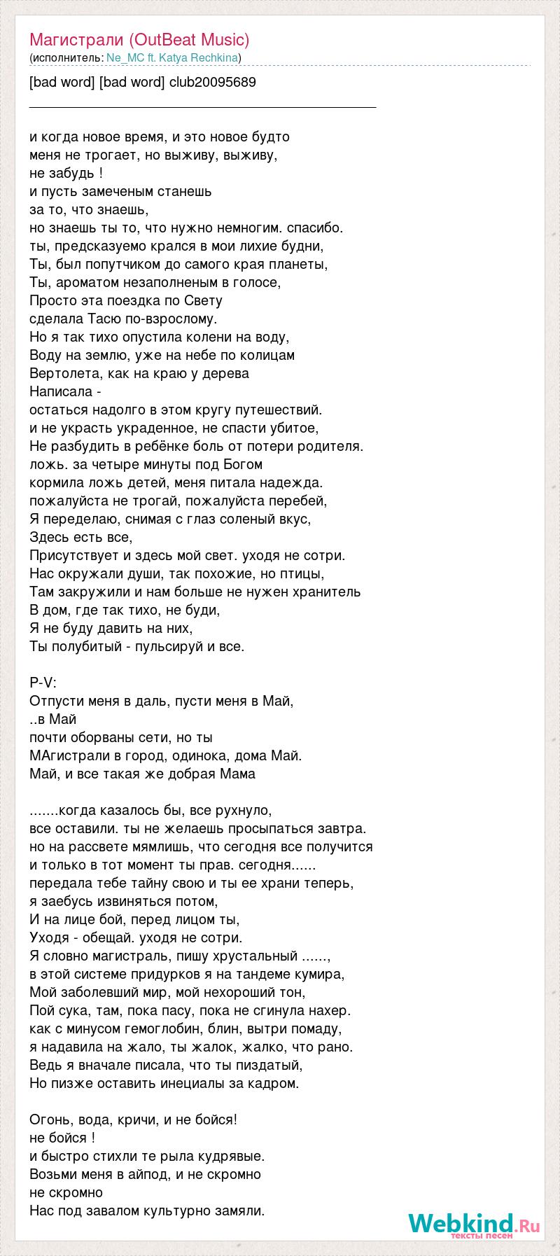 [bad word] [bad word] club20095689 _____________________________________________ и когда новое время, и это новое будто меня не трогает, но выживу, выживу, не забудь ! и пусть замеченым станешь за то, что знаешь, но знаешь ты то, что нужно немногим. спасибо. ты, предсказуемо крался в мои лихие будни, Ты, был попутчиком до самого края планеты, Ты, ароматом незаполненым в голосе, Просто эта поездка по Свету сделала Тасю по-взрослому. Но я так тихо опустила колени на воду, Воду на землю, уже на небе по колицам Вертолета, как на краю у дерева Написала - остаться надолго в этом кругу путешествий. и не украсть украденное, не спасти убитое, Не разбудить в ребёнке боль от потери родителя. ложь. за четыре минуты под Богом кормила ложь детей, меня питала надежда. пожалуйста не трогай, пожалуйста перебей, Я переделаю, снимая с глаз соленый вкус, Здесь есть все, Присутствует и здесь мой свет. уходя не сотри. Нас окружали души, так похожие, но птицы, Там закружили и нам больше не нужен хранитель В дом, где так тихо, не буди, Я не буду давить на них, Ты полубитый - пульсируй и все. P-V: Отпусти меня в даль, пусти меня в Май, ..в Май почти оборваны сети, но ты МАгистрали в город, одинока, дома Май. Май, и все такая же добрая Мама .......когда казалось бы, все рухнуло, все оставили. ты не желаешь просыпаться завтра. но на рассвете мямлишь, что сегодня все получится и только в тот момент ты прав. сегодня...... передала тебе тайну свою и ты ее храни теперь, я заебусь извиняться потом, И на лице бой, перед лицом ты, Уходя - обещай. уходя не сотри. Я словно магистраль, пишу хрустальный ......, в этой системе придурков я на тандеме кумира, Мой заболевший мир, мой нехороший тон, Пой сука, там, пока пасу, пока не сгинула нахер. как с минусом гемоглобин, блин, вытри помаду, я надавила на жало, ты жалок, жалко, что рано. Ведь я вначале писала, что ты пиздатый, Но пизже оставить инециалы за кадром. Огонь, вода, кричи, и не бойся! не бойся ! и быстро стихли те рыла кудрявые. Возьми меня в айпод, и не скромно не скромно Нас под завалом культурно замяли.