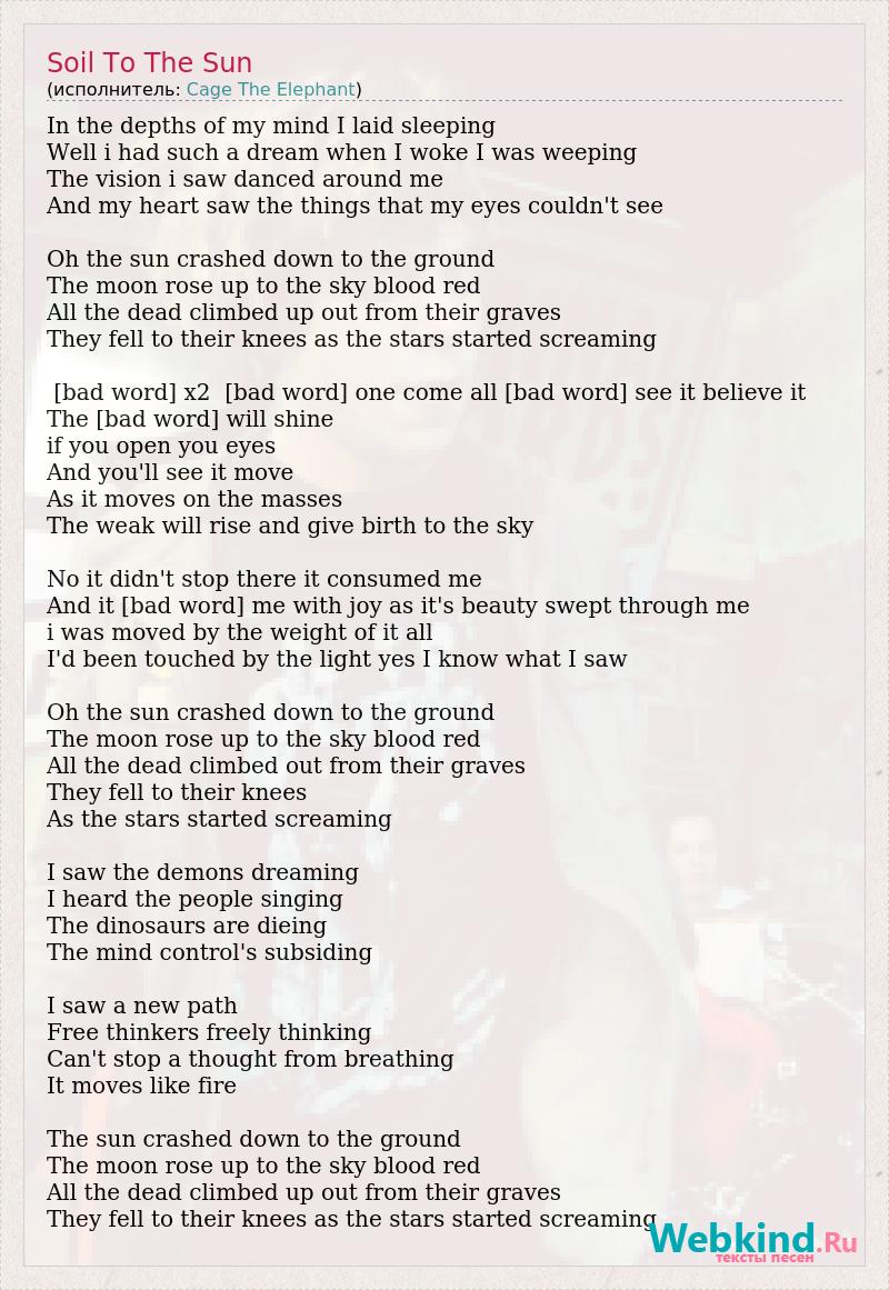 In the depths of my mind I laid sleeping Well i had such a dream when I woke I was weeping The vision i saw danced around me And my heart saw the things that my eyes couldn't see Oh the sun crashed down to the ground The moon rose up to the sky blood red All the dead climbed up out from their graves They fell to their knees as the stars started screaming [bad word] x2 [bad word] one come all [bad word] see it believe it The [bad word] will shine if you open you eyes And you'll see it move As it moves on the masses The weak will rise and give birth to the sky No it didn't stop there it consumed me And it [bad word] me with joy as it's beauty swept through me i was moved by the weight of it all I'd been touched by the light yes I know what I saw Oh the sun crashed down to the ground The moon rose up to the sky blood red All the dead climbed out from their graves They fell to their knees As the stars started screaming I saw the demons dreaming I heard the people singing The dinosaurs are dieing The mind control's subsiding I saw a new path Free thinkers freely thinking Can't stop a thought from breathing It moves like fire The sun crashed down to the ground The moon rose up to the sky blood red All the dead climbed up out from their graves They fell to their knees as the stars started screaming