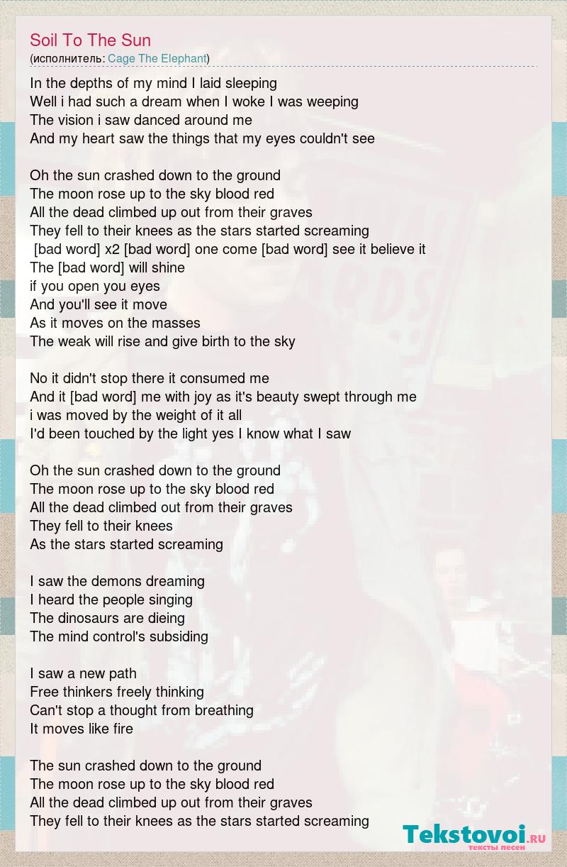 In the depths of my mind I laid sleeping Well i had such a dream when I woke I was weeping The vision i saw danced around me And my heart saw the things that my eyes couldn't see Oh the sun crashed down to the ground The moon rose up to the sky blood red All the dead climbed up out from their graves They fell to their knees as the stars started screaming (Chorus)x2 Come one come all Come see it believe it The truth will shine if you open you eyes And you'll see it move As it moves on the masses The weak will rise and give birth to the sky No it didn't stop there it consumed me And it crushed me with joy as it's beauty swept through me i was moved by the weight of it all I'd been touched by the light yes I know what I saw Oh the sun crashed down to the ground The moon rose up to the sky blood red All the dead climbed out from their graves They fell to their knees As the stars started screaming I saw the demons dreaming I heard the people singing The dinosaurs are dieing The mind control's subsiding I saw a new path Free thinkers freely thinking Can't stop a thought from breathing It moves like fire The sun crashed down to the ground The moon rose up to the sky blood red All the dead climbed up out from their graves They fell to their knees as the stars started screaming