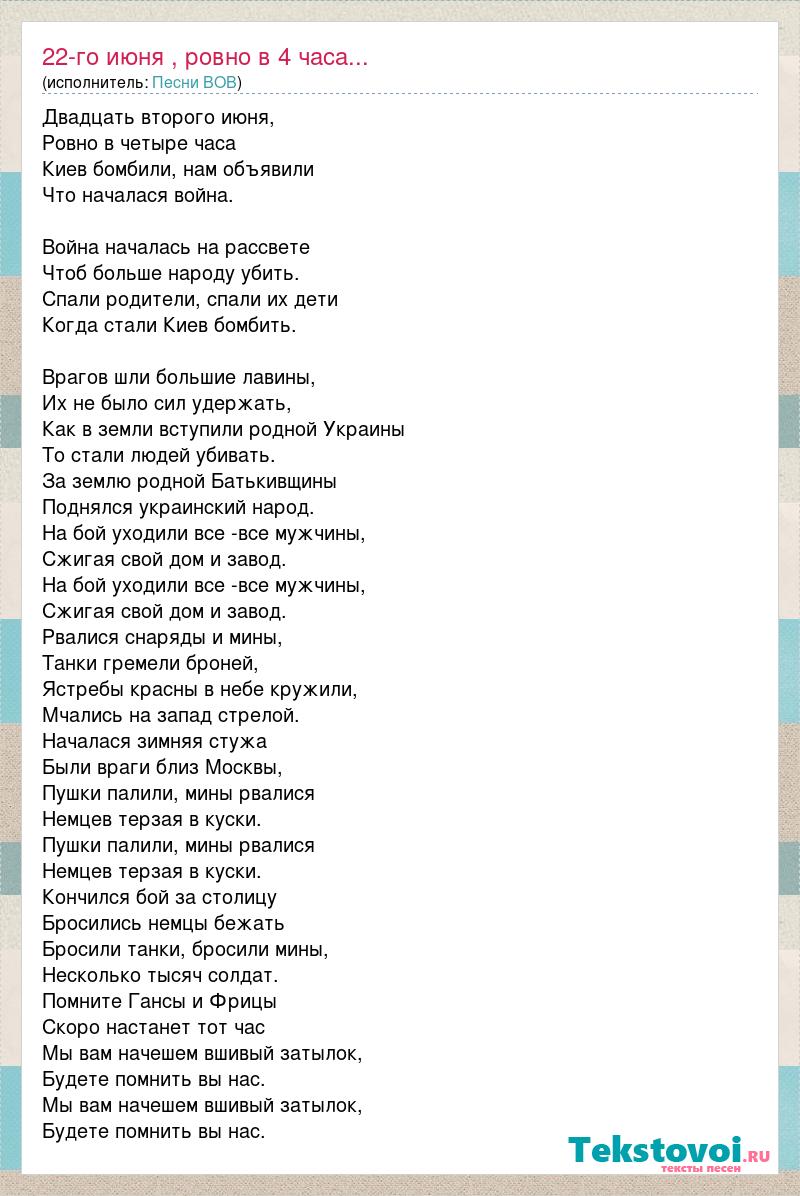 Двадцать второго июня, Ровно в четыре часа Киев бомбили, нам объявили Что началася война. Война началась на рассвете Чтоб больше народу убить. Спали родители, спали их дети Когда стали Киев бомбить. Врагов шли большие лавины, Их не было сил удержать, Как в земли вступили родной Украины То стали людей убивать. За землю родной Батькивщины Поднялся украинский народ. На бой уходили все -все мужчины, Сжигая свой дом и завод. На бой уходили все -все мужчины, Сжигая свой дом и завод. Рвалися снаряды и мины, Танки гремели броней, Ястребы красны в небе кружили, Мчались на запад стрелой. Началася зимняя стужа Были враги близ Москвы, Пушки палили, мины рвалися Немцев терзая в куски. Пушки палили, мины рвалися Немцев терзая в куски. Кончился бой за столицу Бросились немцы бежать Бросили танки, бросили мины, Несколько тысяч солдат. Помните Гансы и Фрицы Скоро настанет тот час Мы вам начешем вшивый затылок, Будете помнить вы нас. Мы вам начешем вшивый затылок, Будете помнить вы нас.