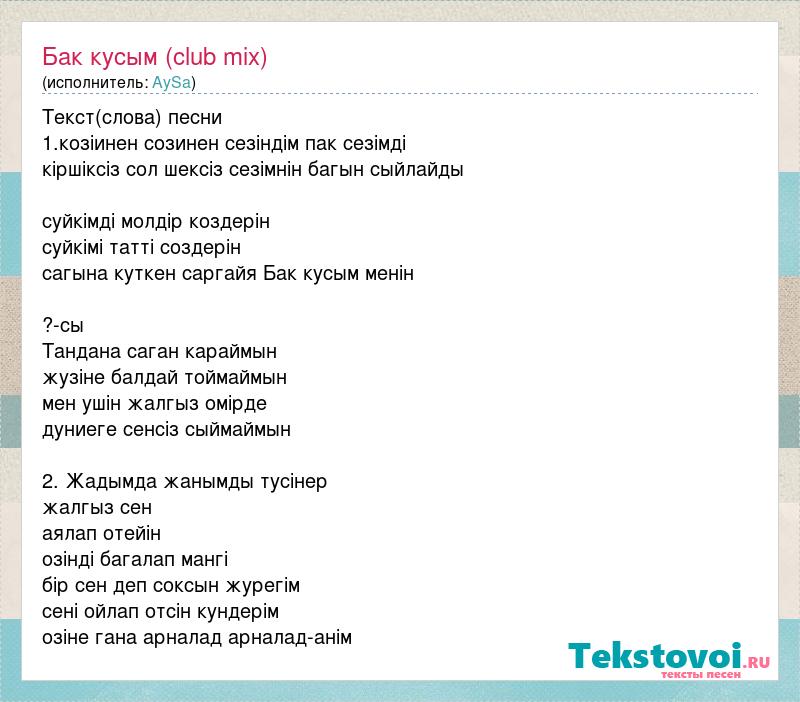 Текст(слова) песни 1.козіинен созинен сезіндім пак сезімді кіршіксіз сол шексіз сезімнін багын сыйлайды суйкімді молдір коздерін суйкімі татті создерін сагына куткен саргайя Бак кусым менін ?-сы Тандана саган караймын жузіне балдай тоймаймын мен ушін жалгыз омірде дуниеге сенсіз сыймаймын 2. Жадымда жанымды тусінер жалгыз сен аялап отейін озінді багалап мангі бір сен деп соксын журегім сені ойлап отсін кундерім озіне гана арналад арналад-анім