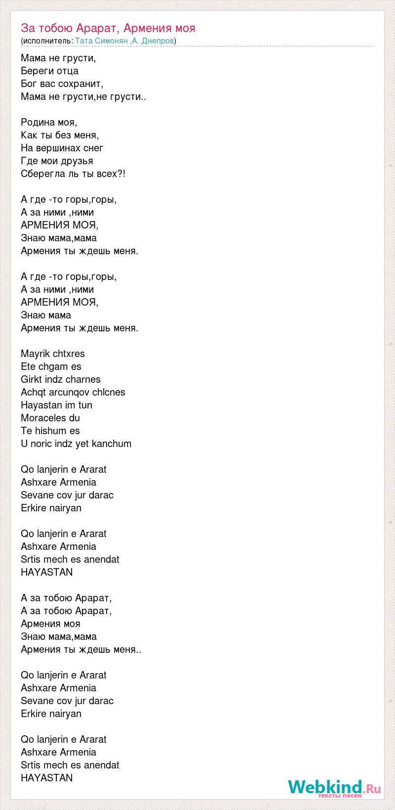 Мама не грусти, Береги отца Бог вас сохранит, Мама не грусти,не грусти.. Родина моя, Как ты без меня, На вершинах снег Где мои друзья Сберегла ль ты всех?! А где -то горы,горы, А за ними ,ними АРМЕНИЯ МОЯ, Знаю мама,мама Армения ты ждешь меня. А где -то горы,горы, А за ними ,ними АРМЕНИЯ МОЯ, Знаю мама Армения ты ждешь меня. Mayrik chtxres Ete chgam es Girkt indz charnes Achqt arcunqov chlcnes Hayastan im tun Moraceles du Te hishum es U noric indz yet kanchum Qo lanjerin e Ararat Ashxare Armenia Sevane cov jur darac Erkire nairyan Qo lanjerin e Ararat Ashxare Armenia Srtis mech es anendat HAYASTAN А за тобою Арарат, А за тобою Арарат, Армения моя Знаю мама,мама Армения ты ждешь меня.. Qo lanjerin e Ararat Ashxare Armenia Sevane cov jur darac Erkire nairyan Qo lanjerin e Ararat Ashxare Armenia Srtis mech es anendat HAYASTAN