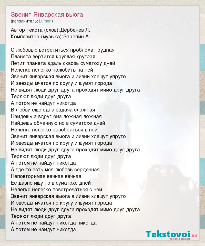 Автор текста (слов):Дербенев Л. Композитор (музыка):Зацепин А. С любовью встретиться проблема трудная Планета вертится круглая круглая Летит планета вдаль сквозь суматоху дней Нелегко нелегко полюбить на ней Звенит январская вьюга и ливни хлещут упруго И звезды мчатся по кругу и шумят города Не видят люди друг друга проходят мимо друг друга Теряют люди друг друга А потом не найдут никогда В любви еще одна задача сложная Найдешь а вдруг она ложная ложная Найдешь обманную но в суматохе дней Нелегко нелегко разобраться в ней Звенит январская вьюга и ливни хлещут упруго И звезды мчатся по кругу и шумят города Не видят люди друг друга проходят мимо друг друга Теряют люди друг друга А потом не найдут никогда А где-то есть моя любовь сердечная Неповторимая вечная вечная Ее давно ищу но в суматохе дней Нелегко нелегко повстречаться с ней Звенит январская вьюга а ливни хлещут упруго И звезды мчатся по кругу и шумят города Не видят люди друг друга проходят мимо друг друга Теряют люди друг друга А потом не найдут никогда никогда А потом не найдут никогда