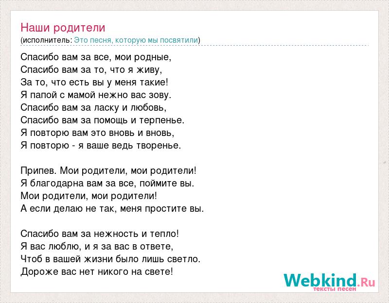 Спасибо вам за все, мои родные, Спасибо вам за то, что я живу, За то, что есть вы у меня такие! Я папой с мамой нежно вас зову. Спасибо вам за ласку и любовь, Спасибо вам за помощь и терпенье. Я повторю вам это вновь и вновь, Я повторю - я ваше ведь творенье. Припев. Мои родители, мои родители! Я благодарна вам за все, поймите вы. Мои родители, мои родители! А если делаю не так, меня простите вы. Спасибо вам за нежность и тепло! Я вас люблю, и я за вас в ответе, Чтоб в вашей жизни было лишь светло. Дороже вас нет никого на свете!
