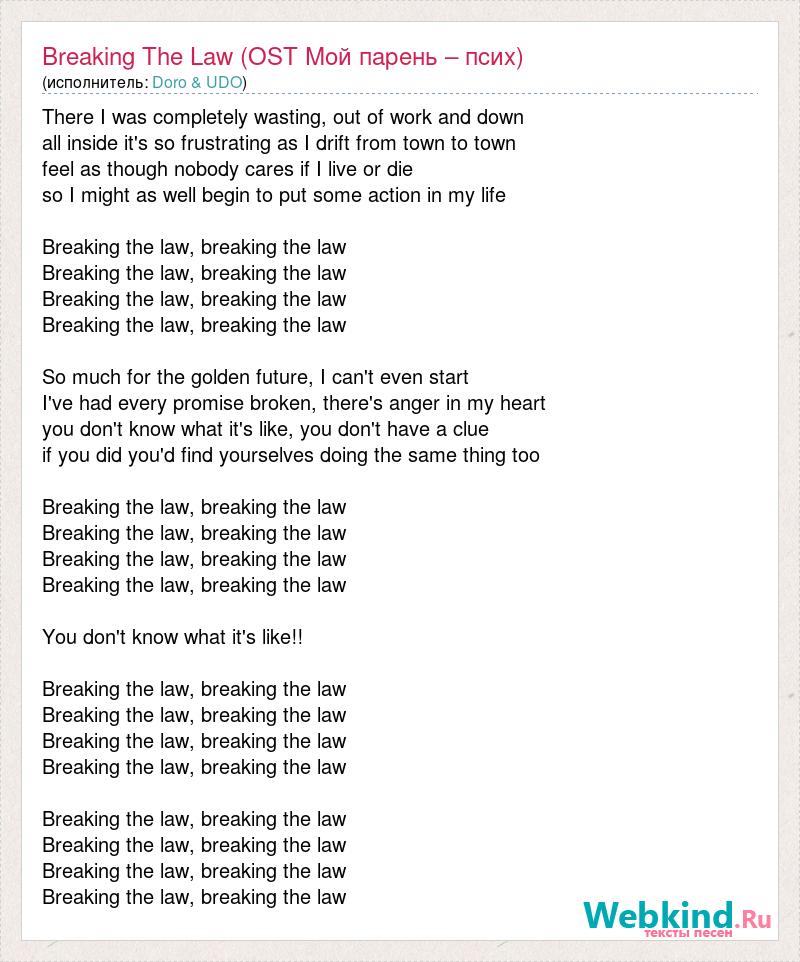 There I was completely wasting, out of work and down all inside it's so frustrating as I drift from town to town feel as though nobody cares if I live or die so I might as well begin to put some action in my life Breaking the law, breaking the law Breaking the law, breaking the law Breaking the law, breaking the law Breaking the law, breaking the law So much for the golden future, I can't even start I've had every promise broken, there's anger in my heart you don't know what it's like, you don't have a clue if you did you'd find yourselves doing the same thing too Breaking the law, breaking the law Breaking the law, breaking the law Breaking the law, breaking the law Breaking the law, breaking the law You don't know what it's like!! Breaking the law, breaking the law Breaking the law, breaking the law Breaking the law, breaking the law Breaking the law, breaking the law Breaking the law, breaking the law Breaking the law, breaking the law Breaking the law, breaking the law Breaking the law, breaking the law