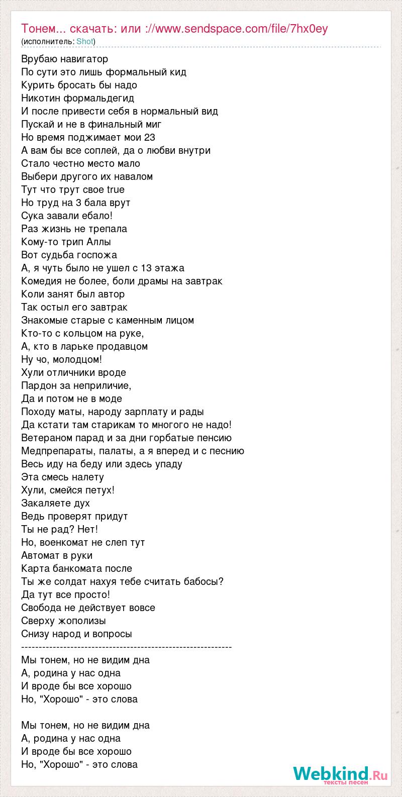 Врубаю навигатор По сути это лишь формальный кид Курить бросать бы надо Никотин формальдегид И после привести себя в нормальный вид Пускай и не в финальный миг Но время поджимает мои 23 А вам бы все соплей, да о любви внутри Стало честно место мало Выбери другого их навалом Тут что трут свое true Но труд на 3 бала врут Сука завали ебало! Раз жизнь не трепала Кому-то трип Аллы Вот судьба госпожа А, я чуть было не ушел с 13 этажа Комедия не более, боли драмы на завтрак Коли занят был автор Так остыл его завтрак Знакомые старые с каменным лицом Кто-то с кольцом на руке, А, кто в ларьке продавцом Ну чо, молодцом! Хули отличники вроде Пардон за неприличие, Да и потом не в моде Походу маты, народу зарплату и рады Да кстати там старикам то многого не надо! Ветераном парад и за дни горбатые пенсию Медпрепараты, палаты, а я вперед и с песнию Весь иду на беду или здесь упаду Эта смесь налету Хули, смейся петух! Закаляете дух Ведь проверят придут Ты не рад? Нет! Но, военкомат не слеп тут Автомат в руки Карта банкомата после Ты же солдат нахуя тебе считать бабосы? Да тут все просто! Свобода не действует вовсе Сверху жополизы Снизу народ и вопросы ------------------------------------------------------------ Мы тонем, но не видим дна А, родина у нас одна И вроде бы все хорошо Но, "Хорошо" - это слова Мы тонем, но не видим дна А, родина у нас одна И вроде бы все хорошо Но, "Хорошо" - это слова