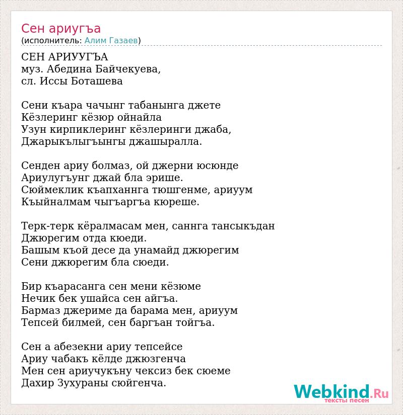 СЕН АРИУУГЪА муз. Абедина Байчекуева, сл. Иссы Боташева Сени къара чачынг табанынга джете Кёзлеринг кёзюр ойнайла Узун кирпиклеринг кёзлеринги джаба, Джарыкълыгъынгы джашыралла. Сенден ариу болмаз, ой джерни юсюнде Ариулугъунг джай бла эрише. Сюймеклик къапханнга тюшгенме, ариуум Къыйналмам чыгъаргъа кюреше. Терк-терк кёралмасам мен, саннга тансыкъдан Джюрегим отда кюеди. Башым къой десе да унамайд джюрегим Сени джюрегим бла сюеди. Бир къарасанга сен мени кёзюме Нечик бек ушайса сен айгъа. Бармаз джериме да барама мен, ариуум Тепсей билмей, сен баргъан тойгъа. Сен а абезекни ариу тепсейсе Ариу чабакъ кёлде джюзгенча Мен сен ариучукъну чексиз бек сюеме Дахир Зухураны сюйгенча.