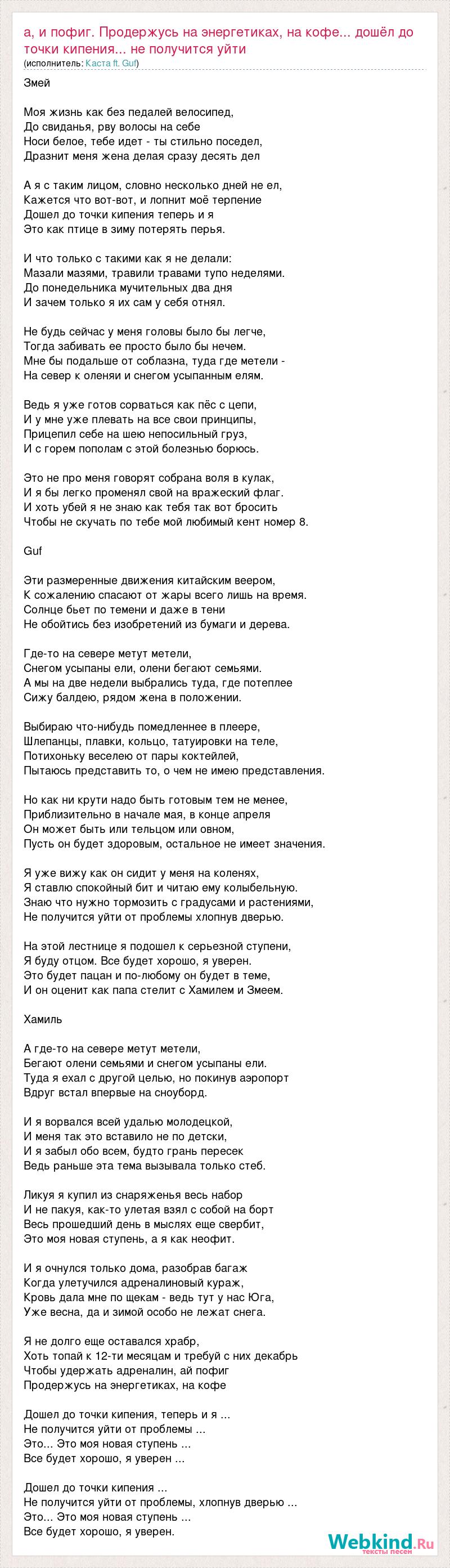 Змей Моя жизнь как без педалей велосипед, До свиданья, рву волосы на себе Носи белое, тебе идет - ты стильно поседел, Дразнит меня жена делая сразу десять дел А я с таким лицом, словно несколько дней не ел, Кажется что вот-вот, и лопнит моё терпение Дошел до точки кипения теперь и я Это как птице в зиму потерять перья. И что только с такими как я не делали: Мазали мазями, травили травами тупо неделями. До понедельника мучительных два дня И зачем только я их сам у себя отнял. Не будь сейчас у меня головы было бы легче, Тогда забивать ее просто было бы нечем. Мне бы подальше от соблазна, туда где метели - На север к оленяи и снегом усыпанным елям. Ведь я уже готов сорваться как пёс с цепи, И у мне уже плевать на все свои принципы, Прицепил себе на шею непосильный груз, И с горем пополам с этой болезнью борюсь. Это не про меня говорят собрана воля в кулак, И я бы легко променял свой на вражеский флаг. И хоть убей я не знаю как тебя так вот бросить Чтобы не скучать по тебе мой любимый кент номер 8. Guf Эти размеренные движения китайским веером, К сожалению спасают от жары всего лишь на время. Солнце бьет по темени и даже в тени Не обойтись без изобретений из бумаги и дерева. Где-то на севере метут метели, Снегом усыпаны ели, олени бегают семьями. А мы на две недели выбрались туда, где потеплее Сижу балдею, рядом жена в положении. Выбираю что-нибудь помедленнее в плеере, Шлепанцы, плавки, кольцо, татуировки на теле, Потихоньку веселею от пары коктейлей, Пытаюсь представить то, о чем не имею представления. Но как ни крути надо быть готовым тем не менее, Приблизительно в начале мая, в конце апреля Он может быть или тельцом или овном, Пусть он будет здоровым, остальное не имеет значения. Я уже вижу как он сидит у меня на коленях, Я ставлю спокойный бит и читаю ему колыбельную. Знаю что нужно тормозить с градусами и растениями, Не получится уйти от проблемы хлопнув дверью. На этой лестнице я подошел к серьезной ступени, Я буду отцом. Все будет хорошо, я уверен. Это будет пацан и по-любому он будет в теме, И он оценит как папа стелит с Хамилем и Змеем. Хамиль А где-то на севере метут метели, Бегают олени семьями и снегом усыпаны ели. Туда я ехал с другой целью, но покинув аэропорт Вдруг встал впервые на сноуборд. И я ворвался всей удалью молодецкой, И меня так это вставило не по детски, И я забыл обо всем, будто грань пересек Ведь раньше эта тема вызывала только стеб. Ликуя я купил из снаряженья весь набор И не пакуя, как-то улетая взял с собой на борт Весь прошедший день в мыслях еще свербит, Это моя новая ступень, а я как неофит. И я очнулся только дома, разобрав багаж Когда улетучился адреналиновый кураж, Кровь дала мне по щекам - ведь тут у нас Юга, Уже весна, да и зимой особо не лежат снега. Я не долго еще оставался храбр, Хоть топай к 12-ти месяцам и требуй с них декабрь Чтобы удержать адреналин, ай пофиг Продержусь на энергетиках, на кофе Дошел до точки кипения, теперь и я ... Не получится уйти от проблемы ... Это... Это моя новая ступень ... Все будет хорошо, я уверен ... Дошел до точки кипения ... Не получится уйти от проблемы, хлопнув дверью ... Это... Это моя новая ступень ... Все будет хорошо, я уверен.