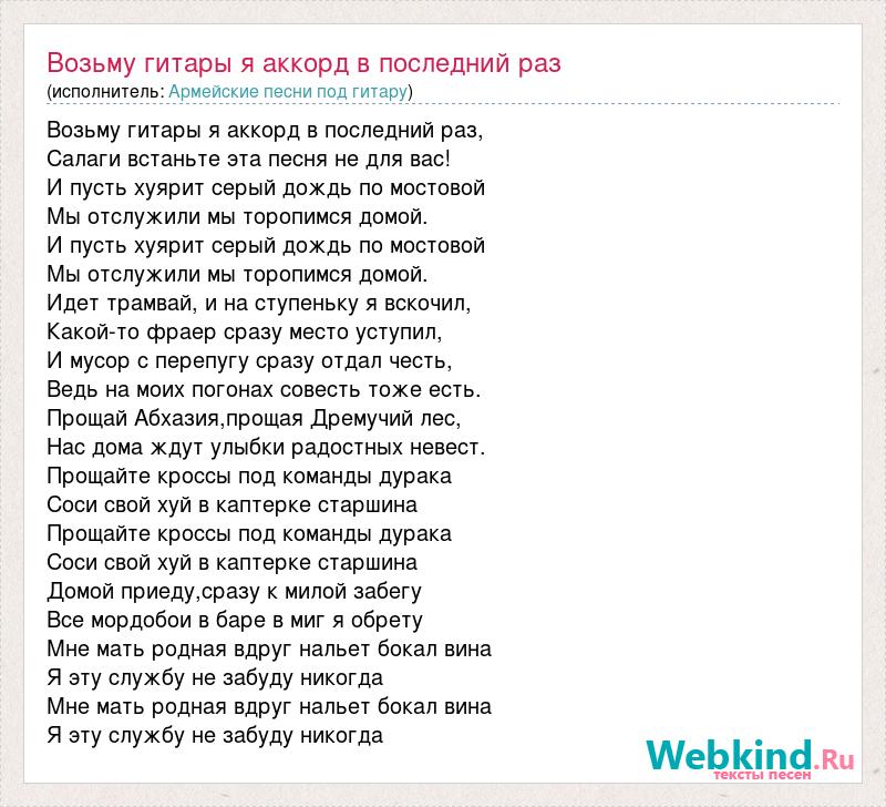 Возьму гитары я аккорд в последний раз, Салаги встаньте эта песня не для вас! И пусть хуярит серый дождь по мостовой Мы отслужили мы торопимся домой. И пусть хуярит серый дождь по мостовой Мы отслужили мы торопимся домой. Идет трамвай, и на ступеньку я вскочил, Какой-то фраер сразу место уступил, И мусор с перепугу сразу отдал честь, Ведь на моих погонах совесть тоже есть. Прощай Абхазия,прощая Дремучий лес, Нас дома ждут улыбки радостных невест. Прощайте кроссы под команды дурака Соси свой хуй в каптерке старшина Прощайте кроссы под команды дурака Соси свой хуй в каптерке старшина Домой приеду,сразу к милой забегу Все мордобои в баре в миг я обрету Мне мать родная вдруг нальет бокал вина Я эту службу не забуду никогда Мне мать родная вдруг нальет бокал вина Я эту службу не забуду никогда