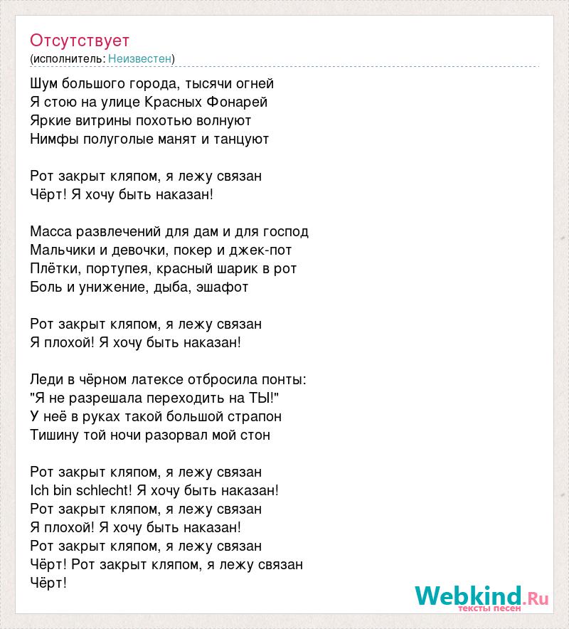 Шум большого города, тысячи огней Я стою на улице Красных Фонарей Яркие витрины похотью волнуют Нимфы полуголые манят и танцуют Рот закрыт кляпом, я лежу связан Чёрт! Я хочу быть наказан! Масса развлечений для дам и для господ Мальчики и девочки, покер и джек-пот Плётки, портупея, красный шарик в рот Боль и унижение, дыба, эшафот Рот закрыт кляпом, я лежу связан Я плохой! Я хочу быть наказан! Леди в чёрном латексе отбросила понты: "Я не разрешала переходить на ТЫ!" У неё в руках такой большой страпон Тишину той ночи разорвал мой стон Рот закрыт кляпом, я лежу связан Ich bin schlecht! Я хочу быть наказан! Рот закрыт кляпом, я лежу связан Я плохой! Я хочу быть наказан! Рот закрыт кляпом, я лежу связан Чёрт! Рот закрыт кляпом, я лежу связан Чёрт!