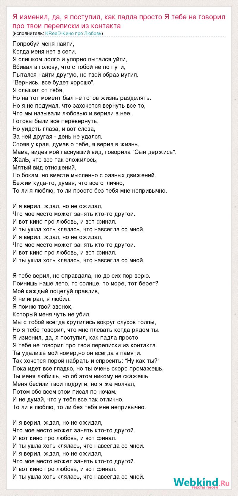 Главная→Исполнители→KReeD-Кино про Любовь→Я изменил, да, я поступил, как падла просто Я тебе не говорил про твои переп