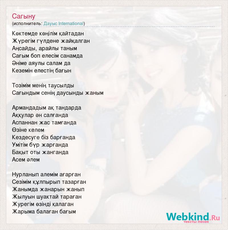 Көктемде көңілім қайтадан Жүрегім гүлдене жайқалган Аңсайды, арайлы таным Сағым боп елесім санамда Әніме аяулы салам да Кеземін елестің бағын Тозімім менің таусылды Сағындым сенің даусынды жаным Армандадым ақ тандарда Аққулар ән салғанда Аспаннан жас тамғанда Өзіне келем Кездесуге біз барғанда Умітім бүр жарғанда Бақыт оты жанганда Асем әлем Нурланып алемім ағарған Сезімім құлпырып тазарған Жанымда жанарын жанып Жылуын шуактай тараған Журегім өзінді қалаган Жарыма балаған бағым