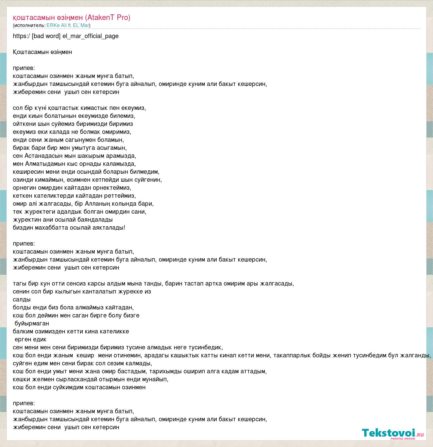 https:/ [bad word] el_mar_official_page Қоштасамын өзiңмен припев: коштасамын озинмен жаным мунга батып, жанбырдын тамшысындай кетемин буга айналып, омиринде куним али бакыт кешерсин, жиберемин сени ушып сен кетерсин сол бір күні қоштастык кимастык пен екеумиз, енди киын болатынын екеумизде билемиз, ойткени шын суйемиз биримизди биримиз екеумиз еки калада не болмак омиримиз, енди сени жаным сагынумен боламын, бирак бари бир мен умытуга асыгамын, сен Астанадасын мын шакырым арамызда, мен Алматыдамын кыс орнады каламызда, кеширесин мени енди осындай боларын билмедим, озинди кимаймын, есимнен кетпейди шын суйгенин, орнегин омирдин кайтадан орнектеймиз, кеткен кателиктерди кайтадан реттеймиз, омир алі жалгасады, бір Алланың колында бари, тек журектеги адалдык болган омирдин сани, журектин ани осылай баяндалады биздин махаббатта осылай аякталады! припев: коштасамын озинмен жаным мунга батып, жанбырдын тамшысындай кетемин буга айналып, омиринде куним али бакыт кешерсин, жиберемин сени ушып сен кетерсин тагы бир кун отти сенсиз карсы алдым мына танды, барин тастап артка омирим ары жалгасады, сенин сол бир кылыгын канталатып журекке из салды болды енди биз бола алмаймыз кайтадан, кош бол деймин мен саган бирге болу бизге буйырмаган балким озимизден кетти кина кателикке ерген едик сен мени мен сени биримизди биримиз тусине алмадык неге тусинбедик, кош бол енди жаным кешир мени отинемин, арадагы кашыктык катты кинап кетти мени, такаппарлык бойды женип тусинбедим бул жалганды, суйген едим мен сени бирак сол сезим калмады, кош бол енди умыт мени жана омир бастадым, тарихымды оширип алга кадам аттадым, кешки желмен сырласкандай отырмын енди мунайып, кош бол енди суйкимдим коштасамын озинмен припев: коштасамын озинмен жаным мунга батып, жанбырдын тамшысындай кетемин буга айналып, омиринде куним али бакыт кешерсин, жиберемин сени ушып сен кетерсин