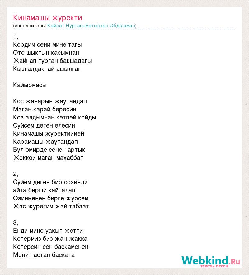 1, Кордим сени мине тагы Оте шыктын касымнан Жайнап турган бакшадагы Кызгалдактай ашылган Кайырмасы Кос жанарын жаутандап Маган карай бересин Коз алдымнан кетпей койды Суйсем деген елесин Кинамашы журектииией Карамашы жаутандап Бул омирде сенен артык Жоккой маган махаббат 2, Суйем деген бир созинди айта берши кайталап Озинменен бирге журсем Жас журегим жай табаат 3, Енди мине уакыт жетти Кетермиз биз жан-жакка Кетерсин сен баскаменен Мени тастап баскага