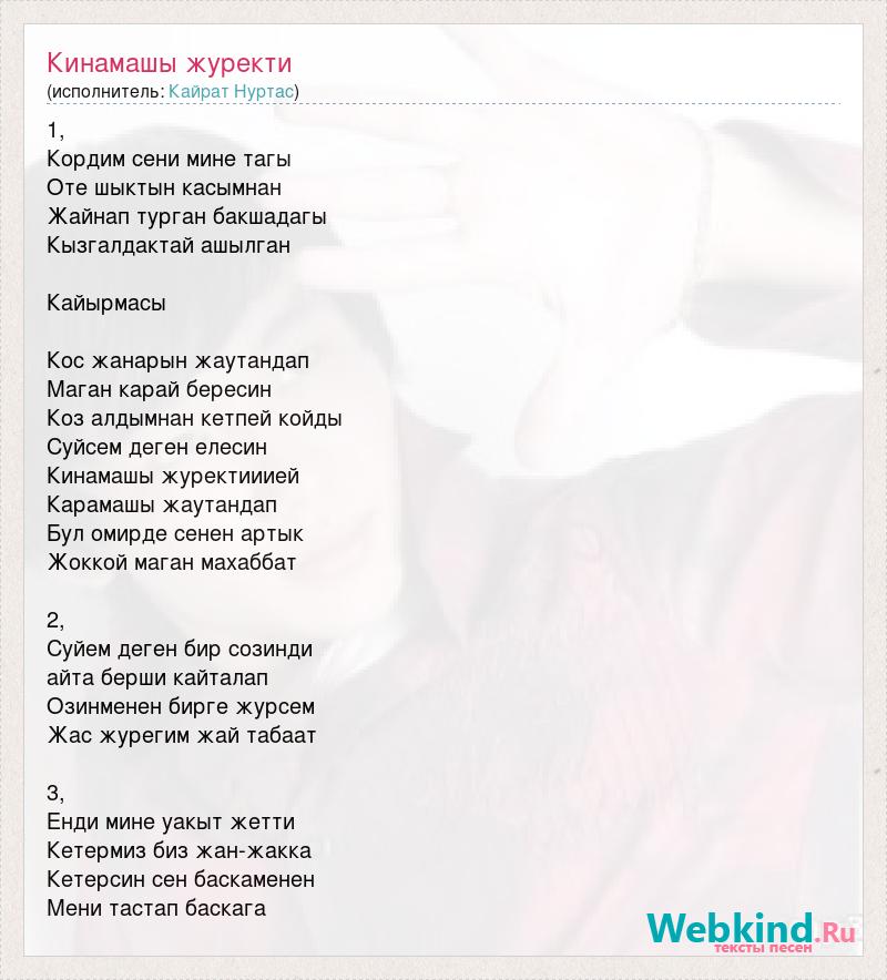 1, Кордим сени мине тагы Оте шыктын касымнан Жайнап турган бакшадагы Кызгалдактай ашылган Кайырмасы Кос жанарын жаутандап Маган карай бересин Коз алдымнан кетпей койды Суйсем деген елесин Кинамашы журектииией Карамашы жаутандап Бул омирде сенен артык Жоккой маган махаббат 2, Суйем деген бир созинди айта берши кайталап Озинменен бирге журсем Жас журегим жай табаат 3, Енди мине уакыт жетти Кетермиз биз жан-жакка Кетерсин сен баскаменен Мени тастап баскага