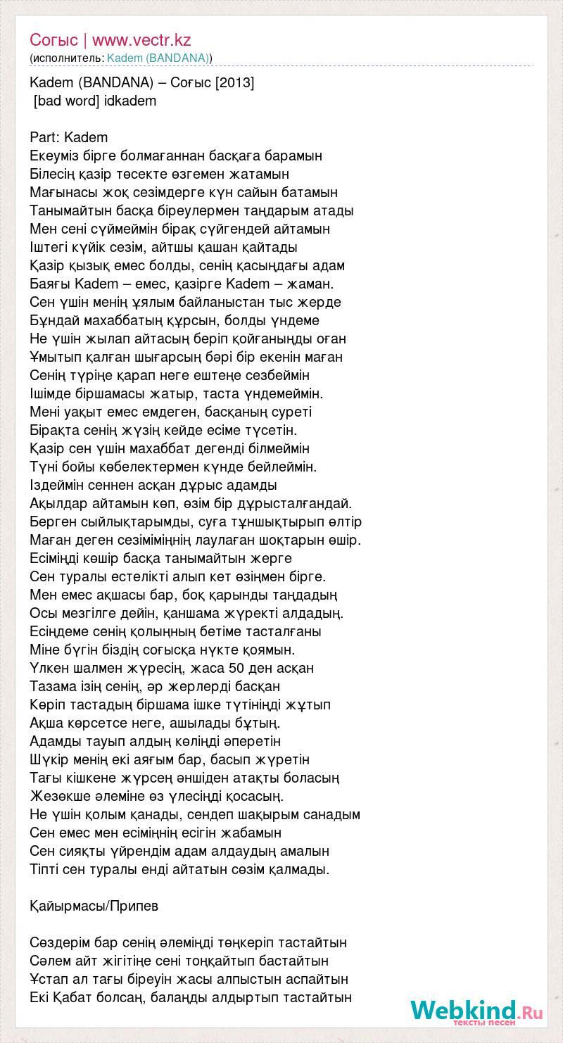 Kadem (BANDANA) – Соғыс [2013] [bad word] idkadem Part: Kadem Екеуміз бірге болмағаннан басқаға барамын Білесің қазір төсекте өзгемен жатамын Мағынасы жоқ сезімдерге күн сайын батамын Танымайтын басқа біреулермен таңдарым атады Мен сені сүймеймін бірақ сүйгендей айтамын Іштегі күйік сезім, айтшы қашан қайтады Қазір қызық емес болды, сенің қасыңдағы адам Баяғы Kadem – емес, қазірге Kadem – жаман. Сен үшін менің ұялым байланыстан тыс жерде Бұндай махаббатың құрсын, болды үндеме Не үшін жылап айтасың беріп қойғаныңды оған Ұмытып қалған шығарсың бәрі бір екенін маған Сенің түріңе қарап неге ештеңе сезбеймін Ішімде біршамасы жатыр, таста үндемеймін. Мені уақыт емес емдеген, басқаның суреті Бірақта сенің жүзің кейде есіме түсетін. Қазір сен үшін махаббат дегенді білмеймін Түні бойы көбелектермен күнде бейлеймін. Іздеймін сеннен асқан дұрыс адамды Ақылдар айтамын көп, өзім бір дұрысталғандай. Берген сыйлықтарымды, суға тұншықтырып өлтір Маған деген сезіміміңнің лаулаған шоқтарын өшір. Есіміңді көшір басқа танымайтын жерге Сен туралы естелікті алып кет өзіңмен бірге. Мен емес ақшасы бар, боқ қарынды таңдадың Осы мезгілге дейін, қаншама жүректі алдадың. Есіңдеме сенің қолыңның бетіме тасталғаны Міне бүгін біздің соғысқа нүкте қоямын. Үлкен шалмен жүресің, жаса 50 ден асқан Тазама ізің сенің, әр жерлерді басқан Көріп тастадың біршама ішке түтініңді жұтып Ақша көрсетсе неге, ашылады бұтың. Адамды тауып алдың көліңді әперетін Шүкір менің екі аяғым бар, басып жүретін Тағы кішкене жүрсең әншіден атақты боласың Жезөкше әлеміне өз үлесіңді қосасың. Не үшін қолым қанады, сендеп шақырым санадым Сен емес мен есіміңнің есігін жабамын Сен сияқты үйрендім адам алдаудың амалын Тіпті сен туралы енді айтатын сөзім қалмады. Қайырмасы/Припев Сөздерім бар сенің әлеміңді төңкеріп тастайтын Сәлем айт жігітіңе сені тоңқайтып бастайтын Ұстап ал тағы біреуін жасы алпыстын аспайтын Екі Қабат болсаң, балаңды алдыртып тастайтын