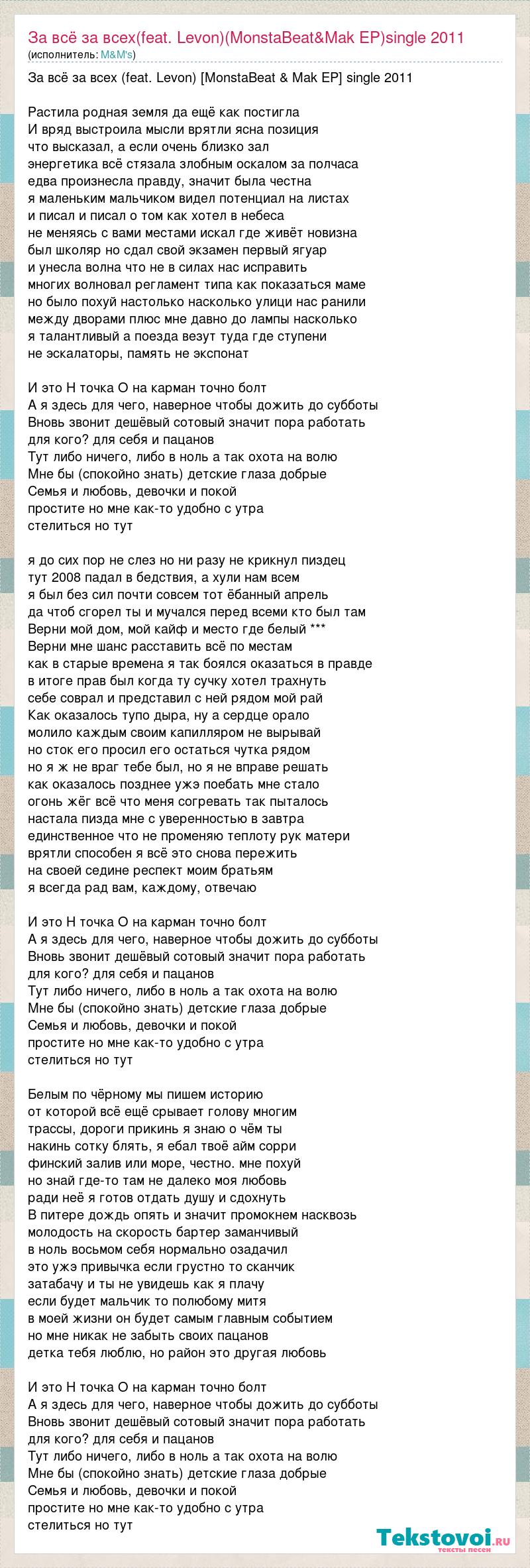 За всё за всех (feat. Levon) [MonstaBeat & Mak EP] single 2011 Растила родная земля да ещё как постигла И вряд выстроила мысли врятли ясна позиция что высказал, а если очень близко зал энергетика всё стязала злобным оскалом за полчаса едва произнесла правду, значит была честна я маленьким мальчиком видел потенциал на листах и писал и писал о том как хотел в небеса не меняясь с вами местами искал где живёт новизна был школяр но сдал свой экзамен первый ягуар и унесла волна что не в силах нас исправить многих волновал регламент типа как показаться маме но было похуй настолько насколько улици нас ранили между дворами плюс мне давно до лампы насколько я талантливый а поезда везут туда где ступени не эскалаторы, память не экспонат И это Н точка О на карман точно болт А я здесь для чего, наверное чтобы дожить до субботы Вновь звонит дешёвый сотовый значит пора работать для кого? для себя и пацанов Тут либо ничего, либо в ноль а так охота на волю Мне бы (спокойно знать) детские глаза добрые Семья и любовь, девочки и покой простите но мне как-то удобно с утра стелиться но тут я до сих пор не слез но ни разу не крикнул пиздец тут 2008 падал в бедствия, а хули нам всем я был без сил почти совсем тот ёбанный апрель да чтоб сгорел ты и мучался перед всеми кто был там Верни мой дом, мой кайф и место где белый *** Верни мне шанс расставить всё по местам как в старые времена я так боялся оказаться в правде в итоге прав был когда ту сучку хотел трахнуть себе соврал и представил с ней рядом мой рай Как оказалось тупо дыра, ну а сердце орало молило каждым своим капилляром не вырывай но сток его просил его остаться чутка рядом но я ж не враг тебе был, но я не вправе решать как оказалось позднее ужэ поебать мне стало огонь жёг всё что меня согревать так пыталось настала пизда мне с уверенностью в завтра единственное что не променяю теплоту рук матери врятли способен я всё это снова пережить на своей седине респект моим братьям я всегда рад вам, каждому, отвечаю И это Н точка О на карман точно болт А я здесь для чего, наверное чтобы дожить до субботы Вновь звонит дешёвый сотовый значит пора работать для кого? для себя и пацанов Тут либо ничего, либо в ноль а так охота на волю Мне бы (спокойно знать) детские глаза добрые Семья и любовь, девочки и покой простите но мне как-то удобно с утра стелиться но тут Белым по чёрному мы пишем историю от которой всё ещё срывает голову многим трассы, дороги прикинь я знаю о чём ты накинь сотку блять, я ебал твоё айм сорри финский залив или море, честно. мне похуй но знай где-то там не далеко моя любовь ради неё я готов отдать душу и сдохнуть В питере дождь опять и значит промокнем насквозь молодость на скорость бартер заманчивый в ноль восьмом себя нормально озадачил это ужэ привычка если грустно то сканчик затабачу и ты не увидешь как я плачу если будет мальчик то полюбому митя в моей жизни он будет самым главным событием но мне никак не забыть своих пацанов детка тебя люблю, но район это другая любовь И это Н точка О на карман точно болт А я здесь для чего, наверное чтобы дожить до субботы Вновь звонит дешёвый сотовый значит пора работать для кого? для себя и пацанов Тут либо ничего, либо в ноль а так охота на волю Мне бы (спокойно знать) детские глаза добрые Семья и любовь, девочки и покой простите но мне как-то удобно с утра стелиться но тут