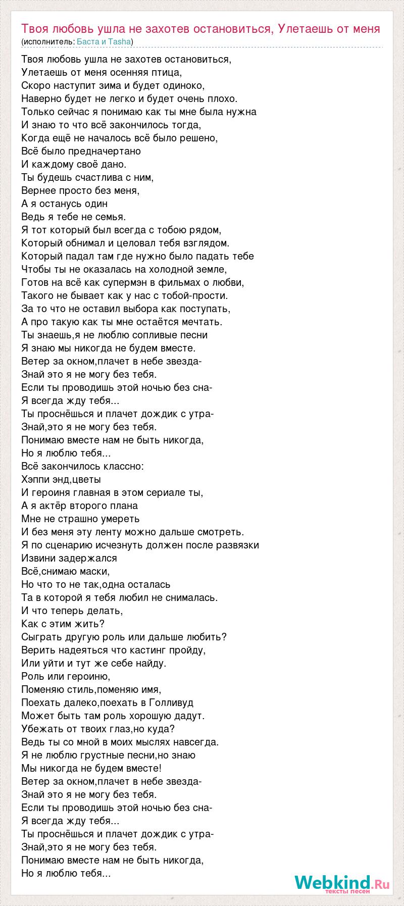 Главная→Исполнители→Баста и Tasha→Твоя любовь ушла не захотев остановиться, Улетаешь от меня осенняя птица, Ск