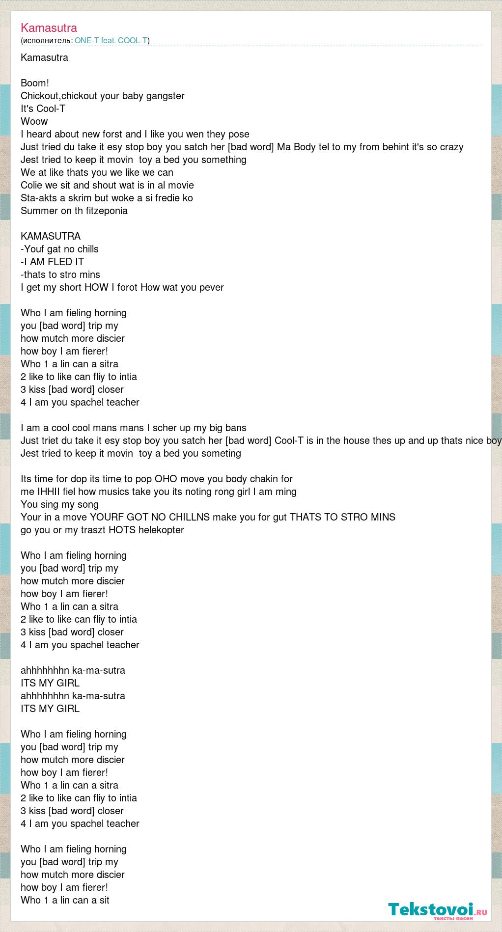 Kamasutra Boom! Chickout,chickout your baby gangster It's Cool-T Woow I heard about new forst and I like you wen they pose Just tried du take it esy stop boy you satch her [bad word] Ma Body tel to my from behint it's so crazy Jest tried to keep it movin toy a bed you something We at like thats you we like we can Colie we sit and shout wat is in al movie Sta-akts a skrim but woke a si fredie ko Summer on th fitzeponia KAMASUTRA -Youf gat no chills -I AM FLED IT -thats to stro mins I get my short HOW I forot How wat you pever Who I am fieling horning you baby comming trip my how mutch more discier how boy I am fierer! Who 1 a lin can a sitra 2 like to like can fliy to intia 3 kiss boyjust com closer 4 I am you spachel teacher I am a cool cool mans mans I scher up my big bans Just triet du take it esy stop boy you satch her [bad word] Cool-T is in the house thes up and up thats nice boy Jest tried to keep it movin toy a bed you someting Its time for dop its time to pop OHO move you body chakin for me IHHII fiel how musics take you its noting rong girl I am ming You sing my song Your in a move YOURF GOT NO CHILLNS make you for gut THATS TO STRO MINS go you or my traszt HOTS helekopter Who I am fieling horning you baby comming trip my how mutch more discier how boy I am fierer! Who 1 a lin can a sitra 2 like to like can fliy to intia 3 kiss boyjust com closer 4 I am you spachel teacher ahhhhhhhn ka-ma-sutra ITS MY GIRL ahhhhhhhn ka-ma-sutra ITS MY GIRL Who I am fieling horning you baby comming trip my how mutch more discier how boy I am fierer! Who 1 a lin can a sitra 2 like to like can fliy to intia 3 kiss boyjust com closer 4 I am you spachel teacher Who I am fieling horning you baby comming trip my how mutch more discier how boy I am fierer! Who 1 a lin can a sit