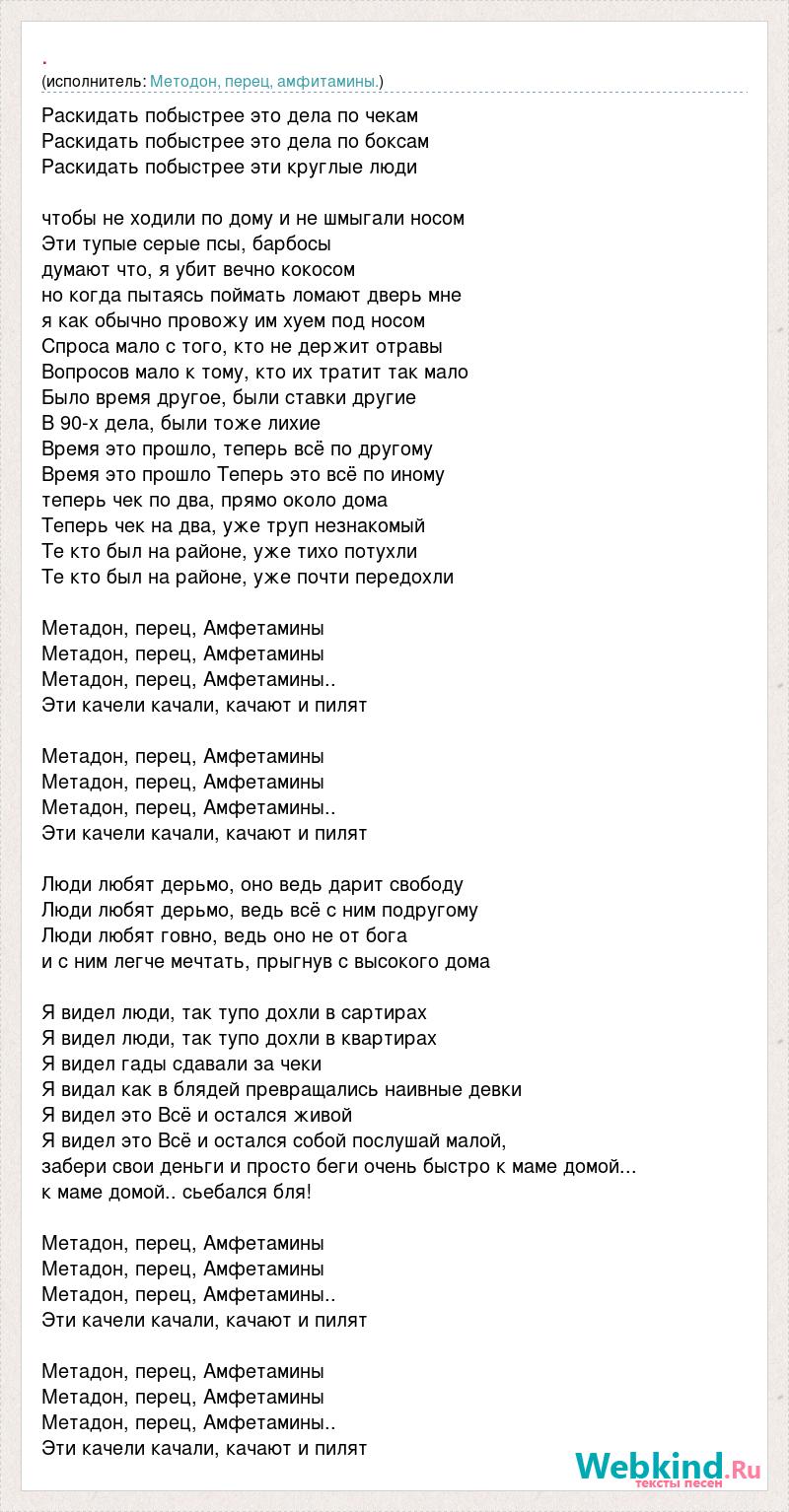 Раскидать побыстрее это дела по чекам Раскидать побыстрее это дела по боксам Раскидать побыстрее эти круглые люди чтобы не ходили по дому и не шмыгали носом Эти тупые серые псы, барбосы думают что, я убит вечно кокосом но когда пытаясь поймать ломают дверь мне я как обычно провожу им хуем под носом Спроса мало с того, кто не держит отравы Вопросов мало к тому, кто их тратит так мало Было время другое, были ставки другие В 90-х дела, были тоже лихие Время это прошло, теперь всё по другому Время это прошло Теперь это всё по иному теперь чек по два, прямо около дома Теперь чек на два, уже труп незнакомый Те кто был на районе, уже тихо потухли Те кто был на районе, уже почти передохли Метадон, перец, Амфетамины Метадон, перец, Амфетамины Метадон, перец, Амфетамины.. Эти качели качали, качают и пилят Метадон, перец, Амфетамины Метадон, перец, Амфетамины Метадон, перец, Амфетамины.. Эти качели качали, качают и пилят Люди любят дерьмо, оно ведь дарит свободу Люди любят дерьмо, ведь всё с ним подругому Люди любят говно, ведь оно не от бога и с ним легче мечтать, прыгнув с высокого дома Я видел люди, так тупо дохли в сартирах Я видел люди, так тупо дохли в квартирах Я видел гады сдавали за чеки Я видал как в блядей превращались наивные девки Я видел это Всё и остался живой Я видел это Всё и остался собой послушай малой, забери свои деньги и просто беги очень быстро к маме домой... к маме домой.. сьебался бля! Метадон, перец, Амфетамины Метадон, перец, Амфетамины Метадон, перец, Амфетамины.. Эти качели качали, качают и пилят Метадон, перец, Амфетамины Метадон, перец, Амфетамины Метадон, перец, Амфетамины.. Эти качели качали, качают и пилят