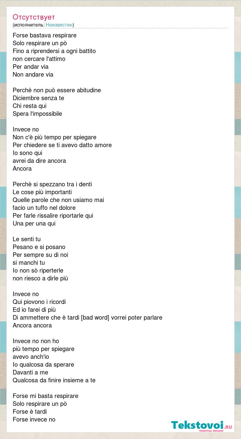Forse bastava respirare Solo respirare un pò Fino a riprendersi a ogni battito non cercare l'attimo Per andar via Non andare via Perchè non può essere abitudine Diciembre senza te Chi resta qui Spera l'impossibile Invece no Non c'è più tempo per spiegare Per chiedere se ti avevo datto amore Io sono qui avrei da dire ancora Ancora Perchè si spezzano tra i denti Le cose più importanti Quelle parole che non usiamo mai facio un tuffo nel dolore Per farle rissalire riportarle qui Una per una qui Le senti tu Pesano e si posano Per sempre su di noi si manchi tu Io non sò riperterle non riesco a dirle più Invece no Qui piovono i ricordi Ed io farei di più Di ammettere che è tardi Come vorrei poter parlare Ancora ancora Invece no non ho più tempo per spiegare avevo anch'io Io qualcosa da sperare Davanti a me Qualcosa da finire insieme a te Forse mi basta respirare Solo respirare un pò Forse è tardi Forse invece no