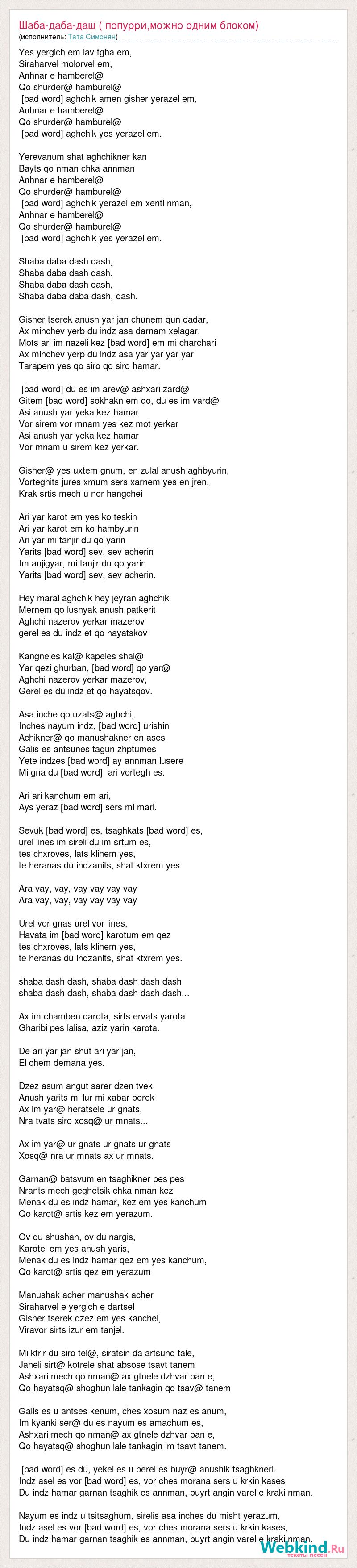 Yes yergich em lav tgha em, Siraharvel molorvel em, Anhnar e hamberel@ Qo shurder@ hamburel@ [bad word] aghchik amen gisher yerazel em, Anhnar e hamberel@ Qo shurder@ hamburel@ [bad word] aghchik yes yerazel em. Yerevanum shat aghchikner kan Bayts qo nman chka annman Anhnar e hamberel@ Qo shurder@ hamburel@ [bad word] aghchik yerazel em xenti nman, Anhnar e hamberel@ Qo shurder@ hamburel@ [bad word] aghchik yes yerazel em. Shaba daba dash dash, Shaba daba dash dash, Shaba daba dash dash, Shaba daba daba dash, dash. Gisher tserek anush yar jan chunem qun dadar, Ax minchev yerb du indz asa darnam xelagar, Mots ari im nazeli kez [bad word] em mi charchari Ax minchev yerp du indz asa yar yar yar yar Tarapem yes qo siro qo siro hamar. [bad word] du es im arev@ ashxari zard@ Gitem [bad word] sokhakn em qo, du es im vard@ Asi anush yar yeka kez hamar Vor sirem vor mnam yes kez mot yerkar Asi anush yar yeka kez hamar Vor mnam u sirem kez yerkar. Gisher@ yes uxtem gnum, en zulal anush aghbyurin, Vorteghits jures xmum sers xarnem yes en jren, Krak srtis mech u nor hangchei Ari yar karot em yes ko teskin Ari yar karot em ko hambyurin Ari yar mi tanjir du qo yarin Yarits [bad word] sev, sev acherin Im anjigyar, mi tanjir du qo yarin Yarits [bad word] sev, sev acherin. Hey maral aghchik hey jeyran aghchik Mernem qo lusnyak anush patkerit Aghchi nazerov yerkar mazerov gerel es du indz et qo hayatskov Kangneles kal@ kapeles shal@ Yar qezi ghurban, [bad word] qo yar@ Aghchi nazerov yerkar mazerov, Gerel es du indz et qo hayatsqov. Asa inche qo uzats@ aghchi, Inches nayum indz, [bad word] urishin Achikner@ qo manushakner en ases Galis es antsunes tagun zhptumes Yete indzes [bad word] ay annman lusere Mi gna du [bad word] ari vortegh es. Ari ari kanchum em ari, Ays yeraz [bad word] sers mi mari. Sevuk [bad word] es, tsaghkats [bad word] es, urel lines im sireli du im srtum es, tes chxroves, lats klinem yes, te heranas du indzanits, shat ktxrem yes. Ara vay, vay, vay vay vay vay Ara vay, vay, vay vay vay vay Urel vor gnas urel vor lines, Havata im [bad word] karotum em qez tes chxroves, lats klinem yes, te heranas du indzanits, shat ktxrem yes. shaba dash dash, shaba dash dash dash shaba dash dash, shaba dash dash dash... Ax im chamben qarota, sirts ervats yarota Gharibi pes lalisa, aziz yarin karota. De ari yar jan shut ari yar jan, El chem demana yes. Dzez asum angut sarer dzen tvek Anush yarits mi lur mi xabar berek Ax im yar@ heratsele ur gnats, Nra tvats siro xosq@ ur mnats... Ax im yar@ ur gnats ur gnats ur gnats Xosq@ nra ur mnats ax ur mnats. Garnan@ batsvum en tsaghikner pes pes Nrants mech geghetsik chka nman kez Menak du es indz hamar, kez em yes kanchum Qo karot@ srtis kez em yerazum. Ov du shushan, ov du nargis, Karotel em yes anush yaris, Menak du es indz hamar qez em yes kanchum, Qo karot@ srtis qez em yerazum Manushak acher manushak acher Siraharvel e yergich e dartsel Gisher tserek dzez em yes kanchel, Viravor sirts izur em tanjel. Mi ktrir du siro tel@, siratsin da artsunq tale, Jaheli sirt@ kotrele shat absose tsavt tanem Ashxari mech qo nman@ ax gtnele dzhvar ban e, Qo hayatsq@ shoghun lale tankagin qo tsav@ tanem Galis es u antses kenum, ches xosum naz es anum, Im kyanki ser@ du es nayum es amachum es, Ashxari mech qo nman@ ax gtnele dzhvar ban e, Qo hayatsq@ shoghun lale tankagin im tsavt tanem. [bad word] es du, yekel es u berel es buyr@ anushik tsaghkneri. Indz asel es vor [bad word] es, vor ches morana sers u krkin kases Du indz hamar garnan tsaghik es annman, buyrt angin varel e kraki nman. Nayum es indz u tsitsaghum, sirelis asa inches du misht yerazum, Indz asel es vor [bad word] es, vor ches morana sers u krkin kases, Du indz hamar garnan tsaghik es annman, buyrt angin varel e kraki nman.