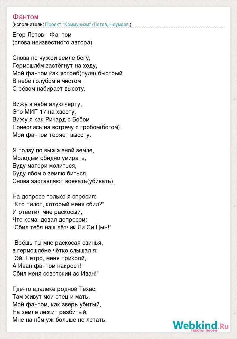 Егор Летов - Фантом (слова неизвестного автора) Снова по чужой земле бегу, Гермошлём застёгнут на ходу, Мой фантом как ястреб(пуля) быстрый В небе голубом и чистом С рёвом набирает высоту. Вижу в небе алую черту, Это МИГ-17 на хвосту, Вижу я как Ричард с Бобом Понеслись на встречу с гробом(богом), Мой фантом теряет высоту. Я ползу по выжженой земле, Молодым обидно умирать, Буду матери молиться, Буду лбом о землю биться, Снова заставляют воевать(убивать). На допросе только я спросил: "Кто пилот, который меня сбил?" И ответил мне раскосый, Что командовал допросом: "Сбил тебя наш лётчик Ли Си Цын!" "Врёшь ты мне раскосая свинья, в гермошлёме чётко слышал я: "Эй, Петро, меня прикрой, А Иван фантом накроет!" Сбил меня советский ас Иван!" Где-то вдалеке родной Техас, Там живут мои отец и мать. Мой фантом, как зверь убитый, На земле лежит разбитый, Мне на нём уж больше не летать.