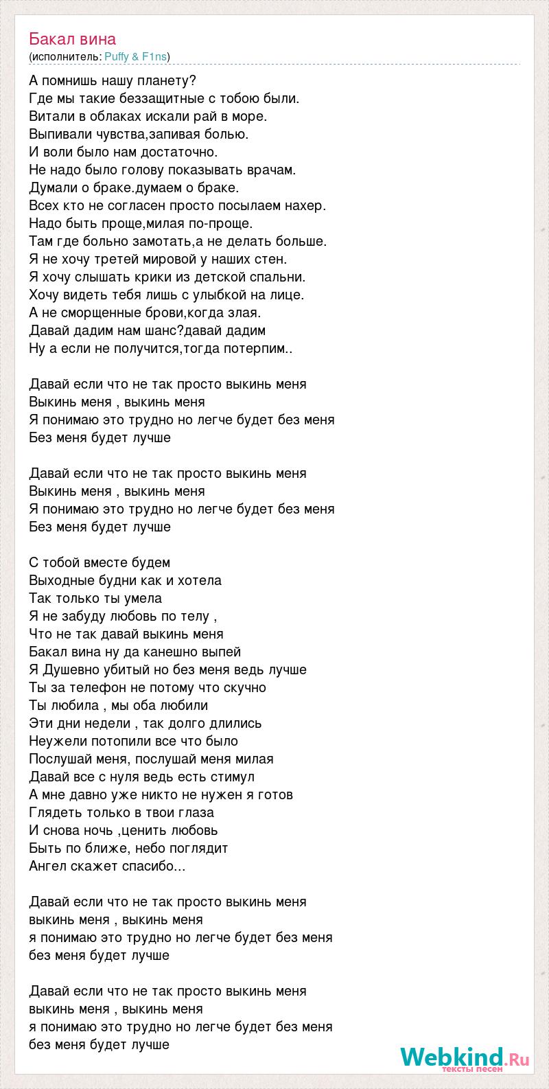А помнишь нашу планету? Где мы такие беззащитные с тобою были. Витали в облаках искали рай в море. Выпивали чувства,запивая болью. И воли было нам достаточно. Не надо было голову показывать врачам. Думали о браке.думаем о браке. Всех кто не согласен просто посылаем нахер. Надо быть проще,милая по-проще. Там где больно замотать,а не делать больше. Я не хочу третей мировой у наших стен. Я хочу слышать крики из детской спальни. Хочу видеть тебя лишь с улыбкой на лице. А не сморщенные брови,когда злая. Давай дадим нам шанс?давай дадим Ну а если не получится,тогда потерпим.. Давай если что не так просто выкинь меня Выкинь меня , выкинь меня Я понимаю это трудно но легче будет без меня Без меня будет лучше Давай если что не так просто выкинь меня Выкинь меня , выкинь меня Я понимаю это трудно но легче будет без меня Без меня будет лучше С тобой вместе будем Выходные будни как и хотела Так только ты умела Я не забуду любовь по телу , Что не так давай выкинь меня Бакал вина ну да канешно выпей Я Душевно убитый но без меня ведь лучше Ты за телефон не потому что скучно Ты любила , мы оба любили Эти дни недели , так долго длились Неужели потопили все что было Послушай меня, послушай меня милая Давай все с нуля ведь есть стимул А мне давно уже никто не нужен я готов Глядеть только в твои глаза И снова ночь ,ценить любовь Быть по ближе, небо поглядит Ангел скажет спасибо... Давай если что не так просто выкинь меня выкинь меня , выкинь меня я понимаю это трудно но легче будет без меня без меня будет лучше Давай если что не так просто выкинь меня выкинь меня , выкинь меня я понимаю это трудно но легче будет без меня без меня будет лучше