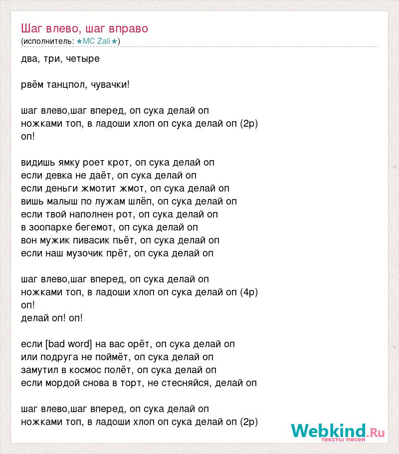 два, три, четыре рвём танцпол, чувачки! шаг влево,шаг вперед, оп сука делай оп ножками топ, в ладоши хлоп оп сука делай оп (2р) оп! видишь ямку роет крот, оп сука делай оп если девка не даёт, оп сука делай оп если деньги жмотит жмот, оп сука делай оп вишь малыш по лужам шлёп, оп сука делай оп если твой наполнен рот, оп сука делай оп в зоопарке бегемот, оп сука делай оп вон мужик пивасик пьёт, оп сука делай оп если наш музочик прёт, оп сука делай оп шаг влево,шаг вперед, оп сука делай оп ножками топ, в ладоши хлоп оп сука делай оп (4р) оп! делай оп! оп! если [bad word] на вас орёт, оп сука делай оп или подруга не поймёт, оп сука делай оп замутил в космос полёт, оп сука делай оп если мордой снова в торт, не стесняйся, делай оп шаг влево,шаг вперед, оп сука делай оп ножками топ, в ладоши хлоп оп сука делай оп (2р)