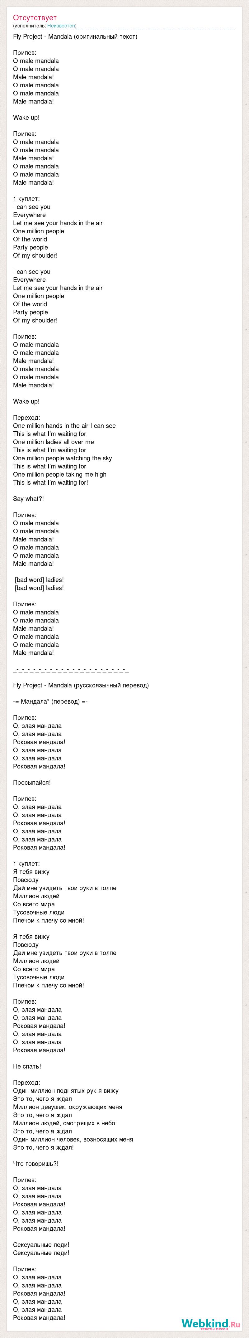 Fly Project - Mandala (оригинальный текст) Припев: O male mandala O male mandala Male mandala! O male mandala O male mandala Male mandala! Wake up! Припев: O male mandala O male mandala Male mandala! O male mandala O male mandala Male mandala! 1 куплет: I can see you Everywhere Let me see your hands in the air One million people Of the world Party people Of my shoulder! I can see you Everywhere Let me see your hands in the air One million people Of the world Party people Of my shoulder! Припев: O male mandala O male mandala Male mandala! O male mandala O male mandala Male mandala! Wake up! Переход: One million hands in the air I can see This is what I’m waiting for One million ladies all over me This is what I’m waiting for One million people watching the sky This is what I’m waiting for One million people taking me high This is what I’m waiting for! Say what?! Припев: O male mandala O male mandala Male mandala! O male mandala O male mandala Male mandala! [bad word] ladies! [bad word] ladies! Припев: O male mandala O male mandala Male mandala! O male mandala O male mandala Male mandala! _-_-_-_-_-_-_-_-_-_-_-_-_-_-_-_-_-_-_-_-_ Fly Project - Mandala (русскоязычный перевод) -= Мандала* (перевод) =- Припев: О, злая мандала О, злая мандала Роковая мандала! О, злая мандала О, злая мандала Роковая мандала! Просыпайся! Припев: О, злая мандала О, злая мандала Роковая мандала! О, злая мандала О, злая мандала Роковая мандала! 1 куплет: Я тебя вижу Повсюду Дай мне увидеть твои руки в толпе Миллион людей Со всего мира Тусовочные люди Плечом к плечу со мной! Я тебя вижу Повсюду Дай мне увидеть твои руки в толпе Миллион людей Со всего мира Тусовочные люди Плечом к плечу со мной! Припев: О, злая мандала О, злая мандала Роковая мандала! О, злая мандала О, злая мандала Роковая мандала! Не спать! Переход: Один миллион поднятых рук я вижу Это то, чего я ждал Миллион девушек, окружающих меня Это то, чего я ждал Миллион людей, смотрящих в небо Это то, чего я ждал Один миллион человек, возносящих меня Это то, чего я ждал! Что говоришь?! Припев: О, злая мандала О, злая мандала Роковая мандала! О, злая мандала О, злая мандала Роковая мандала! Сексуальные леди! Сексуальные леди! Припев: О, злая мандала О, злая мандала Роковая мандала! О, злая мандала О, злая мандала Роковая мандала!
