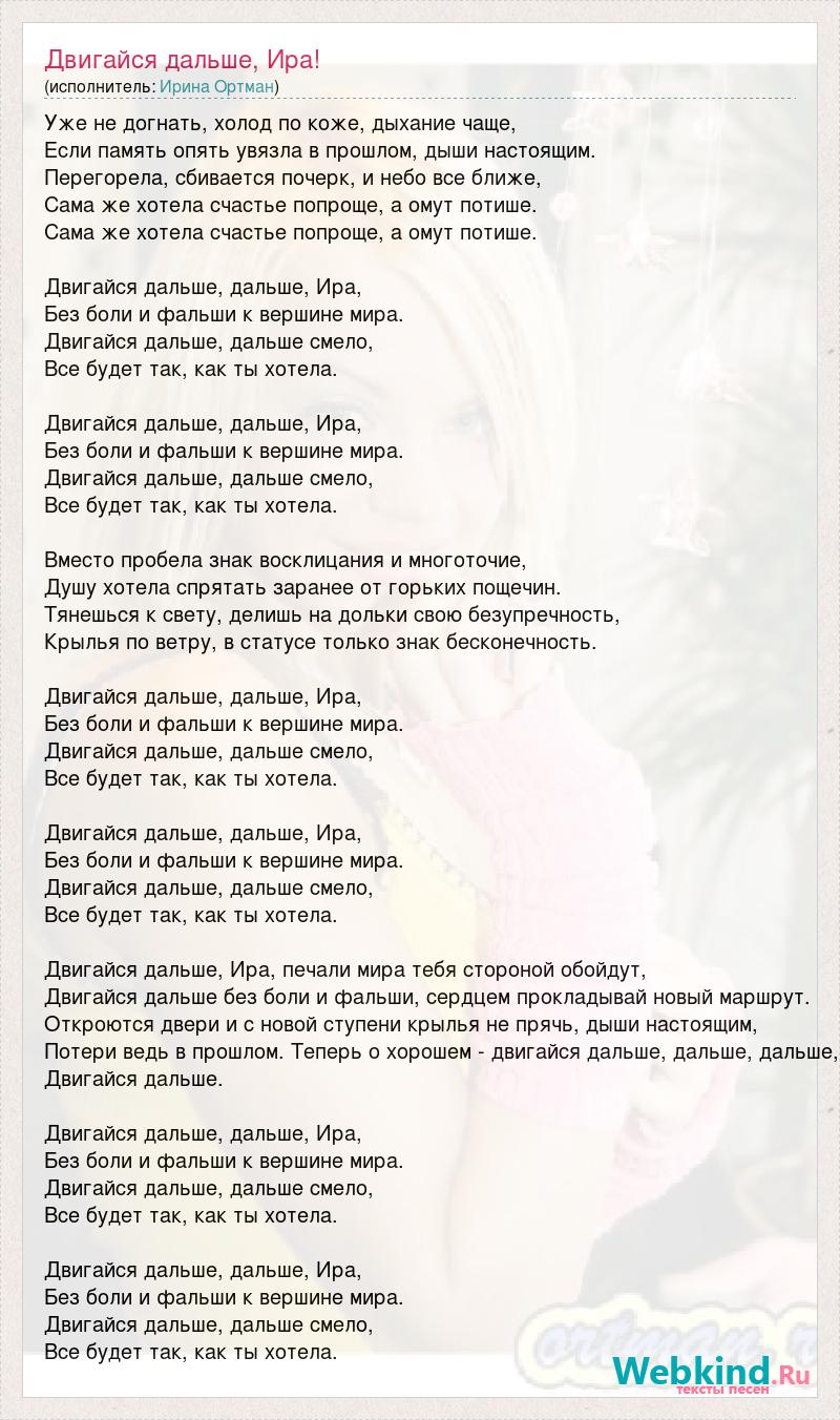 Уже не догнать, холод по коже, дыхание чаще, Если память опять увязла в прошлом, дыши настоящим. Перегорела, сбивается почерк, и небо все ближе, Сама же хотела счастье попроще, а омут потише. Сама же хотела счастье попроще, а омут потише. Двигайся дальше, дальше, Ира, Без боли и фальши к вершине мира. Двигайся дальше, дальше смело, Все будет так, как ты хотела. Двигайся дальше, дальше, Ира, Без боли и фальши к вершине мира. Двигайся дальше, дальше смело, Все будет так, как ты хотела. Вместо пробела знак восклицания и многоточие, Душу хотела спрятать заранее от горьких пощечин. Тянешься к свету, делишь на дольки свою безупречность, Крылья по ветру, в статусе только знак бесконечность. Двигайся дальше, дальше, Ира, Без боли и фальши к вершине мира. Двигайся дальше, дальше смело, Все будет так, как ты хотела. Двигайся дальше, дальше, Ира, Без боли и фальши к вершине мира. Двигайся дальше, дальше смело, Все будет так, как ты хотела. Двигайся дальше, Ира, печали мира тебя стороной обойдут, Двигайся дальше без боли и фальши, сердцем прокладывай новый маршрут. Откроются двери и с новой ступени крылья не прячь, дыши настоящим, Потери ведь в прошлом. Теперь о хорошем - двигайся дальше, дальше, дальше, Двигайся дальше. Двигайся дальше, дальше, Ира, Без боли и фальши к вершине мира. Двигайся дальше, дальше смело, Все будет так, как ты хотела. Двигайся дальше, дальше, Ира, Без боли и фальши к вершине мира. Двигайся дальше, дальше смело, Все будет так, как ты хотела.