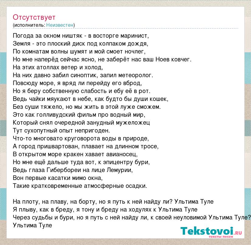 Погода за окном ништяк - в восторге маринист, Земля - это плоский диск под колпаком дождя, По комнатам волны шумят и мой смоет ночлег, Но мне наперёд сейчас ясно, не заберёт нас ваш Ноев ковчег. На этих атоллах ветер и холод, На них давно забил синоптик, запил метеоролог. Повсюду море, я вряд ли перейду его вброд, Но я беру собственную слабость и ебу её в рот. Ведь чайки мяукают в небе, как будто бы души кошек, Без суши тяжело, но мы жить в этой луже сможем. Это как голливудский фильм про водный мир, Который снял очередной занудный мужеложец Тут сухопутный опыт непригоден. Что-то многовато круговорота воды в природе, А город пришвартован, плавает на длинном тросе, В открытом море кракен хавает авианосец, Но мне ещё дальше туда вот, к эпицентру бури, Ведь глаза Гибербореи на лице Лемурии, Вон первые касатки мимо окна, Такие кратковременные атмосферные осадки. На плоту, на плаву, на борту, но я путь к ней найду ли? Ультима Туле Я плыву, как в бреду, я тону и бреду на ходулях к Ультима Туле Через судьбы и бури, но я путь с ней найду ли, к своей неуловимой Ультима Туле? Ультима Туле