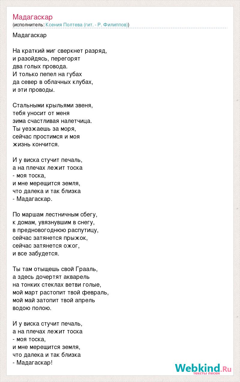 Мадагаскар На краткий миг сверкнет разряд, и разойдясь, перегорят два голых провода. И только пепел на губах да север в облачных клубах, и эти проводы. Стальными крыльями звеня, тебя уносит от меня зима счастливая налетчица. Ты уезжаешь за моря, сейчас простимся и моя жизнь кончится. И у виска стучит печаль, а на плечах лежит тоска - моя тоска, и мне мерещится земля, что далека и так близка - Мадагаскар. По маршам лестничным сбегу, к домам, увязнувшим в снегу, в предновогоднюю распутицу, сейчас затянется прыжок, сейчас затянется ожог, и все забудется. Ты там отыщешь свой Грааль, а здесь дочертят акварель на тонких стеклах ветви голые, мой март растопит твой февраль, мой май затопит твой апрель водою полою. И у виска стучит печаль, а на плечах лежит тоска - моя тоска, и мне мерещится земля, что далека и так близка - Мадагаскар!