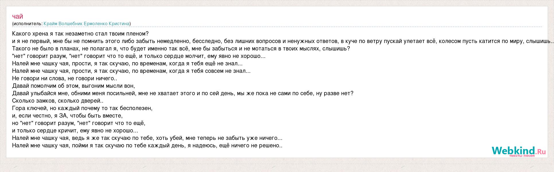 Какого хрена я так незаметно стал твоим пленом? и я не первый, мне бы не помнить этого либо забыть немедленно, бесследно, без лишних вопросов и ненужных ответов, в куче по ветру пускай улетает всё, колесом пусть катится по миру, слышишь.. Такого не было в планах, не полагал я, что будет именно так всё, мне бы забыться и не мотаться в твоих мыслях, слышишь? "нет" говорит разум, "нет" говорит что то ещё, и только сердце молчит, ему явно не хорошо... Налей мне чашку чая, прости, я так скучаю, по временам, когда я тебя ещё не знал... Налей мне чашку чая, прости, я так скучаю, по временам, когда я тебя совсем не знал... Не говори ни слова, не говори ничего.. Давай помолчим об этом, выгоним мысли вон, Давай улыбайся мне, обними меня посильней, мне не хватает этого и по сей день, мы же пока не сами по себе, ну разве нет? Сколько замков, сколько дверей.. Гора ключей, но каждый почему то так бесполезен, и, если честно, я ЗА, чтобы быть вместе, но "нет" говорит разум, "нет" говорит что то ещё, и только сердце кричит, ему явно не хорошо... Налей мне чашку чая, ведь я же так скучаю по тебе, хоть убей, мне теперь не забыть уже ничего... Налей мне чашку чая, пойми я так скучаю по тебе каждый день, я надеюсь, ещё ничего не решено..