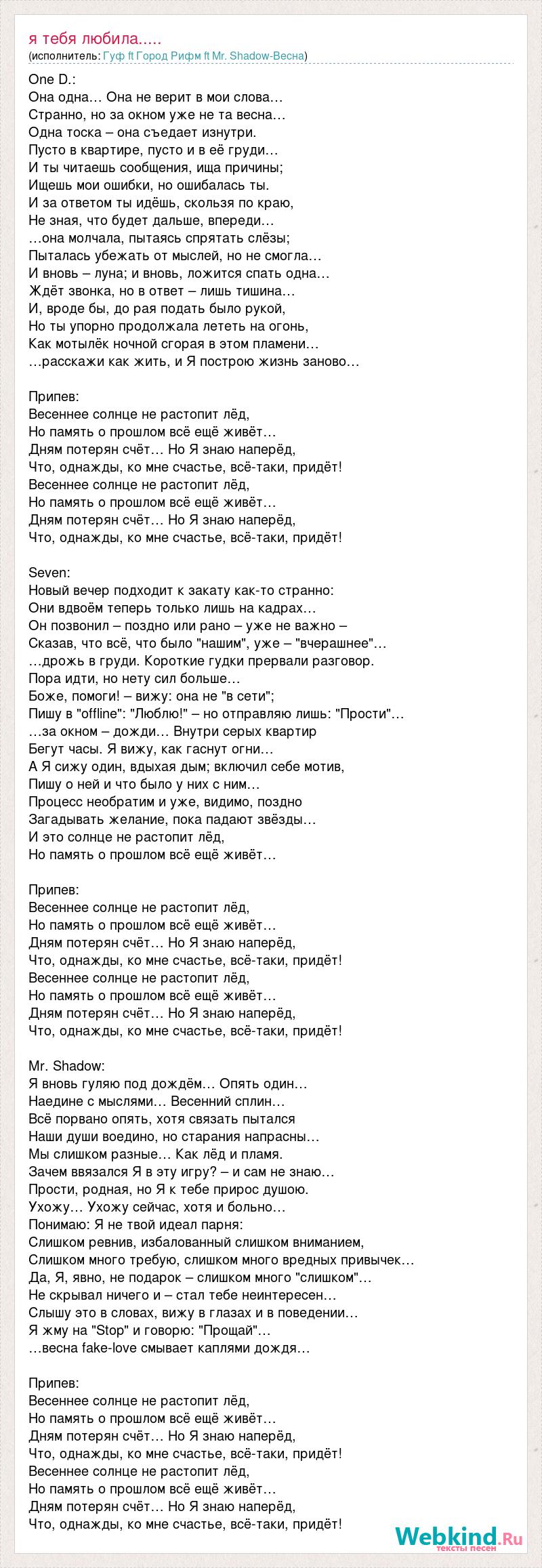 One D.: Она одна… Она не верит в мои слова… Странно, но за окном уже не та весна… Одна тоска – она съедает изнутри. Пусто в квартире, пусто и в её груди… И ты читаешь сообщения, ища причины; Ищешь мои ошибки, но ошибалась ты. И за ответом ты идёшь, скользя по краю, Не зная, что будет дальше, впереди… …она молчала, пытаясь спрятать слёзы; Пыталась убежать от мыслей, но не смогла… И вновь – луна; и вновь, ложится спать одна… Ждёт звонка, но в ответ – лишь тишина… И, вроде бы, до рая подать было рукой, Но ты упорно продолжала лететь на огонь, Как мотылёк ночной сгорая в этом пламени… …расскажи как жить, и Я построю жизнь заново… Припев: Весеннее солнце не растопит лёд, Но память о прошлом всё ещё живёт… Дням потерян счёт… Но Я знаю наперёд, Что, однажды, ко мне счастье, всё-таки, придёт! Весеннее солнце не растопит лёд, Но память о прошлом всё ещё живёт… Дням потерян счёт… Но Я знаю наперёд, Что, однажды, ко мне счастье, всё-таки, придёт! Seven: Новый вечер подходит к закату как-то странно: Они вдвоём теперь только лишь на кадрах… Он позвонил – поздно или рано – уже не важно – Сказав, что всё, что было "нашим", уже – "вчерашнее"… …дрожь в груди. Короткие гудки прервали разговор. Пора идти, но нету сил больше… Боже, помоги! – вижу: она не "в сети"; Пишу в "offline": "Люблю!" – но отправляю лишь: "Прости"… …за окном – дожди… Внутри серых квартир Бегут часы. Я вижу, как гаснут огни… А Я сижу один, вдыхая дым; включил себе мотив, Пишу о ней и что было у них с ним… Процесс необратим и уже, видимо, поздно Загадывать желание, пока падают звёзды… И это солнце не растопит лёд, Но память о прошлом всё ещё живёт… Припев: Весеннее солнце не растопит лёд, Но память о прошлом всё ещё живёт… Дням потерян счёт… Но Я знаю наперёд, Что, однажды, ко мне счастье, всё-таки, придёт! Весеннее солнце не растопит лёд, Но память о прошлом всё ещё живёт… Дням потерян счёт… Но Я знаю наперёд, Что, однажды, ко мне счастье, всё-таки, придёт! Mr. Shadow: Я вновь гуляю под дождём… Опять один… Наедине с мыслями… Весенний сплин… Всё порвано опять, хотя связать пытался Наши души воедино, но старания напрасны… Мы слишком разные… Как лёд и пламя. Зачем ввязался Я в эту игру? – и сам не знаю… Прости, родная, но Я к тебе прирос душою. Ухожу… Ухожу сейчас, хотя и больно… Понимаю: Я не твой идеал парня: Слишком ревнив, избалованный слишком вниманием, Слишком много требую, слишком много вредных привычек… Да, Я, явно, не подарок – слишком много "слишком"… Не скрывал ничего и – стал тебе неинтересен… Слышу это в словах, вижу в глазах и в поведении… Я жму на "Stop" и говорю: "Прощай"… …весна fake-love смывает каплями дождя… Припев: Весеннее солнце не растопит лёд, Но память о прошлом всё ещё живёт… Дням потерян счёт… Но Я знаю наперёд, Что, однажды, ко мне счастье, всё-таки, придёт! Весеннее солнце не растопит лёд, Но память о прошлом всё ещё живёт… Дням потерян счёт… Но Я знаю наперёд, Что, однажды, ко мне счастье, всё-таки, придёт!