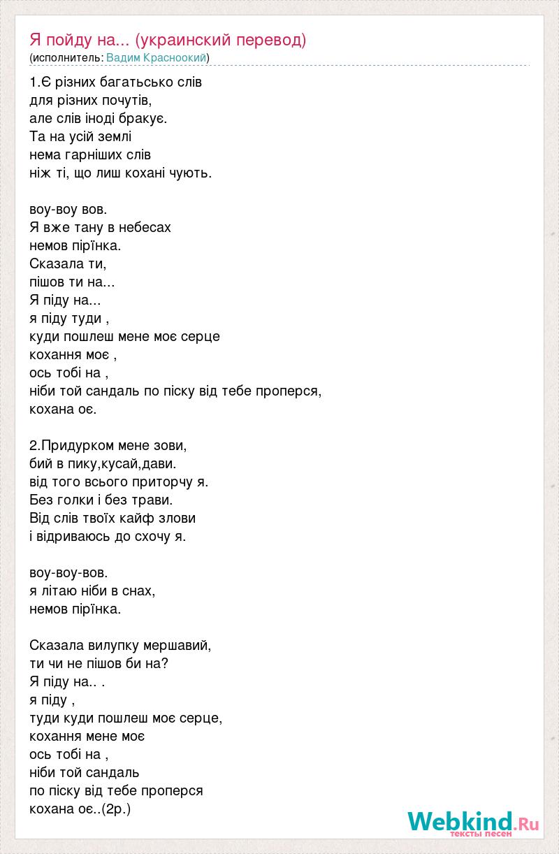 1.Є різних багатьсько слів для різних почутів, але слів іноді бракує. Та на усій землі нема гарніших слів ніж ті, що лиш кохані чують. воу-воу вов. Я вже тану в небесах немов пірїнка. Сказала ти, пішов ти на... Я піду на... я піду туди , куди пошлеш мене моє серце кохання моє , ось тобі на , ніби той сандаль по піску від тебе проперся, кохана оє. 2.Придурком мене зови, бий в пику,кусай,дави. від того всього приторчу я. Без голки і без трави. Від слів твоїх кайф злови і відриваюсь до схочу я. воу-воу-вов. я літаю ніби в снах, немов пірїнка. Сказала вилупку мершавий, ти чи не пішов би на? Я піду на.. . я піду , туди куди пошлеш моє серце, кохання мене моє ось тобі на , ніби той сандаль по піску від тебе проперся кохана оє..(2р.)