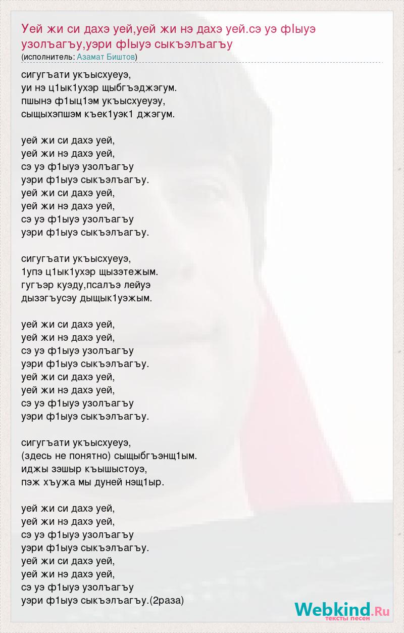 сигугъати укъысхуеуэ, уи нэ ц1ык1ухэр щыбгъэджэгум. пшынэ ф1ыц1эм укъысхуеуэу, сыщыхэпшэм къек1уэк1 джэгум. уей жи си дахэ уей, уей жи нэ дахэ уей, сэ уэ ф1ыуэ узолъагъу уэри ф1ыуэ сыкъэлъагъу. уей жи си дахэ уей, уей жи нэ дахэ уей, сэ уэ ф1ыуэ узолъагъу уэри ф1ыуэ сыкъэлъагъу. сигугъати укъысхуеуэ, 1упэ ц1ык1ухэр щызэтежым. гугъэр куэду,псалъэ лейуэ дызэгъусэу дыщык1уэжым. уей жи си дахэ уей, уей жи нэ дахэ уей, сэ уэ ф1ыуэ узолъагъу уэри ф1ыуэ сыкъэлъагъу. уей жи си дахэ уей, уей жи нэ дахэ уей, сэ уэ ф1ыуэ узолъагъу уэри ф1ыуэ сыкъэлъагъу. сигугъати укъысхуеуэ, (здесь не понятно) сыщыбгъэнщ1ым. иджы зэшыр къышыстоуэ, пэж хъужа мы дуней нэщ1ыр. уей жи си дахэ уей, уей жи нэ дахэ уей, сэ уэ ф1ыуэ узолъагъу уэри ф1ыуэ сыкъэлъагъу. уей жи си дахэ уей, уей жи нэ дахэ уей, сэ уэ ф1ыуэ узолъагъу уэри ф1ыуэ сыкъэлъагъу.(2раза)