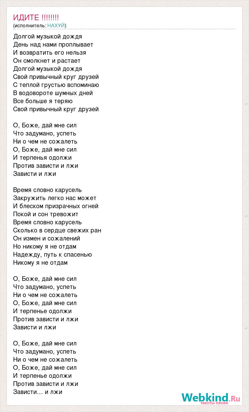 Долгой музыкой дождя День над нами проплывает И возвратить его нельзя Он смолкнет и растает Долгой музыкой дождя Свой привычный круг друзей С теплой грустью вспоминаю В водовороте шумных дней Все больше я теряю Свой привычный круг друзей О, Боже, дай мне сил Что задумано, успеть Ни о чем не сожалеть О, Боже, дай мне сил И терпенья одолжи Против зависти и лжи Зависти и лжи Время словно карусель Закружить легко нас может И блеском призрачных огней Покой и сон тревожит Время словно карусель Сколько в сердце свежих ран Он измен и сожалений Но никому я не отдам Надежду, путь к спасенью Никому я не отдам О, Боже, дай мне сил Что задумано, успеть Ни о чем не сожалеть О, Боже, дай мне сил И терпенье одолжи Против зависти и лжи Зависти и лжи О, Боже, дай мне сил Что задумано, успеть Ни о чем не сожалеть О, Боже, дай мне сил И терпенье одолжи Против зависти и лжи Зависти… и лжи