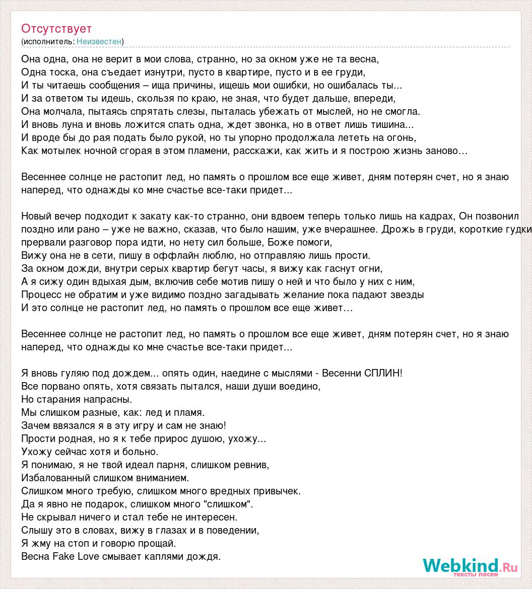 Она одна, она не верит в мои слова, странно, но за окном уже не та весна, Одна тоска, она съедает изнутри, пусто в квартире, пусто и в ее груди, И ты читаешь сообщения – ища причины, ищешь мои ошибки, но ошибалась ты... И за ответом ты идешь, скользя по краю, не зная, что будет дальше, впереди, Она молчала, пытаясь спрятать слезы, пыталась убежать от мыслей, но не смогла. И вновь луна и вновь ложится спать одна, ждет звонка, но в ответ лишь тишина... И вроде бы до рая подать было рукой, но ты упорно продолжала лететь на огонь, Как мотылек ночной сгорая в этом пламени, расскажи, как жить и я построю жизнь заново… Весеннее солнце не растопит лед, но память о прошлом все еще живет, дням потерян счет, но я знаю наперед, что однажды ко мне счастье все-таки придет... Новый вечер подходит к закату как-то странно, они вдвоем теперь только лишь на кадрах, Он позвонил поздно или рано – уже не важно, сказав, что было нашим, уже вчерашнее. Дрожь в груди, короткие гудки прервали разговор пора идти, но нету сил больше, Боже помоги, Вижу она не в сети, пишу в оффлайн люблю, но отправляю лишь прости. За окном дожди, внутри серых квартир бегут часы, я вижу как гаснут огни, А я сижу один вдыхая дым, включив себе мотив пишу о ней и что было у них с ним, Процесс не обратим и уже видимо поздно загадывать желание пока падают звезды И это солнце не растопит лед, но память о прошлом все еще живет… Весеннее солнце не растопит лед, но память о прошлом все еще живет, дням потерян счет, но я знаю наперед, что однажды ко мне счастье все-таки придет... Я вновь гуляю под дождем... опять один, наедине с мыслями - Весенни СПЛИН! Все порвано опять, хотя связать пытался, наши души воедино, Но старания напрасны. Мы слишком разные, как: лед и пламя. Зачем ввязался я в эту игру и сам не знаю! Прости родная, но я к тебе прирос душою, ухожу... Ухожу сейчас хотя и больно. Я понимаю, я не твой идеал парня, слишком ревнив, Избалованный слишком вниманием. Слишком много требую, слишком много вредных привычек. Да я явно не подарок, слишком много "слишком". Не скрывал ничего и стал тебе не интересен. Слышу это в словах, вижу в глазах и в поведении, Я жму на стоп и говорю прощай. Весна Fake Love смывает каплями дождя.