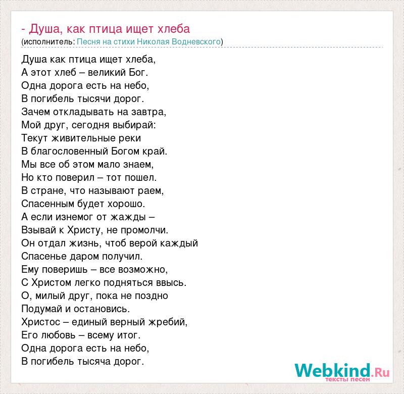 Душа как птица ищет хлеба, А этот хлеб – великий Бог. Одна дорога есть на небо, В погибель тысячи дорог. Зачем откладывать на завтра, Мой друг, сегодня выбирай: Текут живительные реки В благословенный Богом край. Мы все об этом мало знаем, Но кто поверил – тот пошел. В стране, что называют раем, Спасенным будет хорошо. А если изнемог от жажды – Взывай к Христу, не промолчи. Он отдал жизнь, чтоб верой каждый Спасенье даром получил. Ему поверишь – все возможно, С Христом легко подняться ввысь. О, милый друг, пока не поздно Подумай и остановись. Христос – единый верный жребий, Его любовь – всему итог. Одна дорога есть на небо, В погибель тысяча дорог.