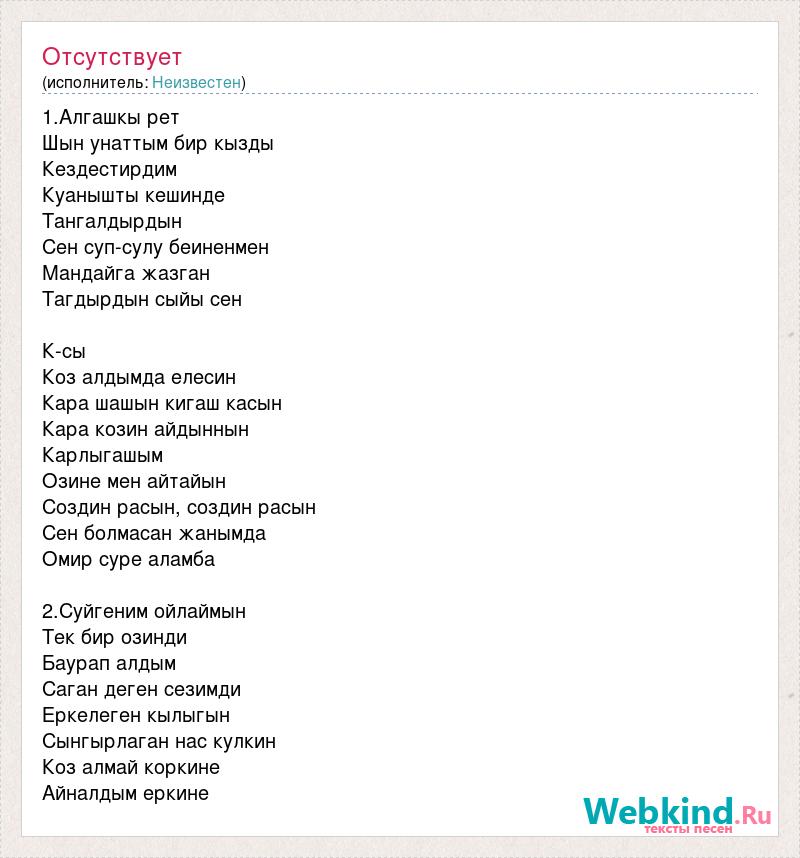 1.Алгашкы рет Шын унаттым бир кызды Кездестирдим Куанышты кешинде Тангалдырдын Сен суп-сулу беиненмен Мандайга жазган Тагдырдын сыйы сен К-сы Коз алдымда елесин Кара шашын кигаш касын Кара козин айдыннын Карлыгашым Озине мен айтайын Создин расын, создин расын Сен болмасан жанымда Омир суре аламба 2.Суйгеним ойлаймын Тек бир озинди Баурап алдым Саган деген сезимди Еркелеген кылыгын Сынгырлаган нас кулкин Коз алмай коркине Айналдым еркине