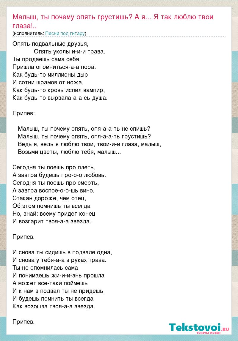 Главная→Исполнители→Песни под гитару→Малыш, ты почему опять грустишь? А я... Я так люблю твои глаза!..