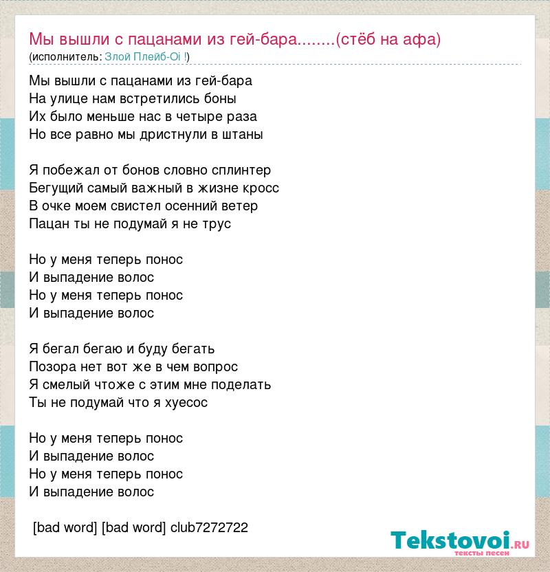 Мы вышли с пацанами из гей-бара На улице нам встретились боны Их было меньше нас в четыре раза Но все равно мы дристнули в штаны Я побежал от бонов словно сплинтер Бегущий самый важный в жизне кросс В очке моем свистел осенний ветер Пацан ты не подумай я не трус Но у меня теперь понос И выпадение волос Но у меня теперь понос И выпадение волос Я бегал бегаю и буду бегать Позора нет вот же в чем вопрос Я смелый чтоже с этим мне поделать Ты не подумай что я хуесос Но у меня теперь понос И выпадение волос Но у меня теперь понос И выпадение волос [bad word] [bad word] club7272722