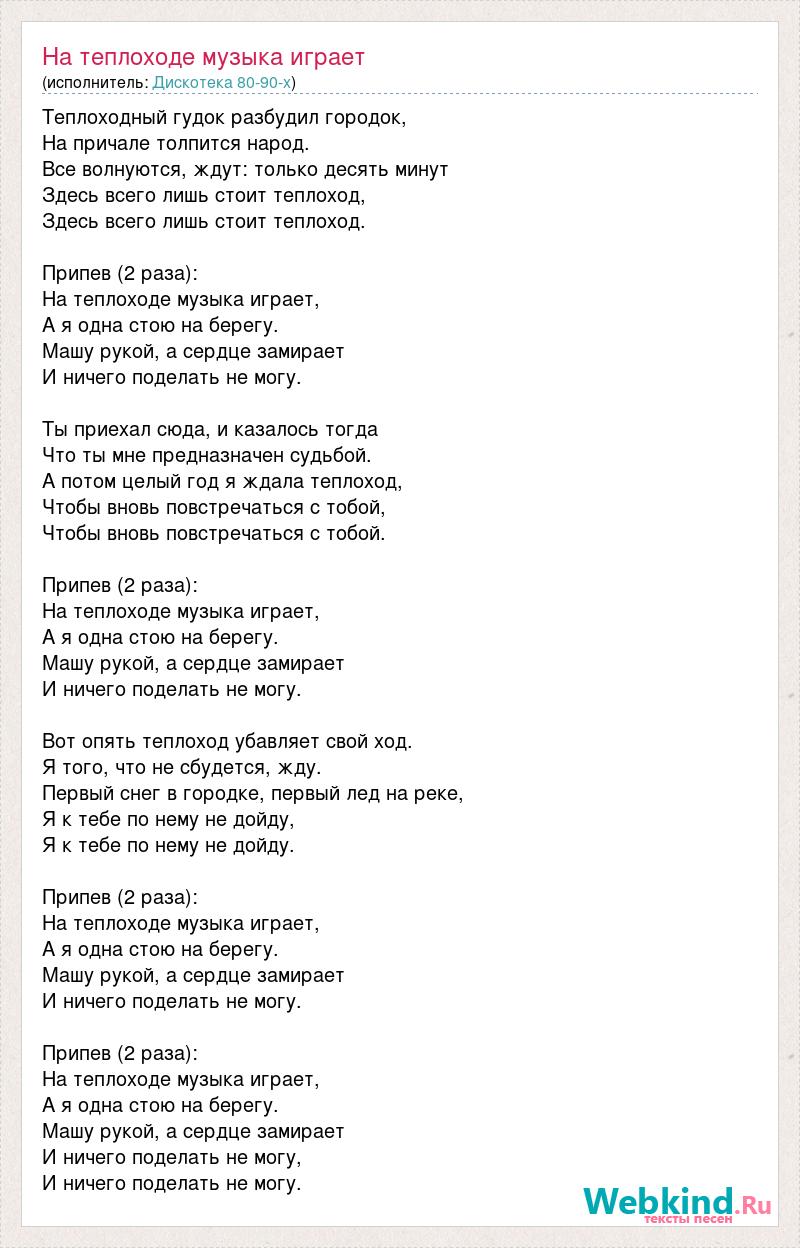Теплоходный гудок разбудил городок, На причале толпится народ. Все волнуются, ждут: только десять минут Здесь всего лишь стоит теплоход, Здесь всего лишь стоит теплоход. Припев (2 раза): На теплоходе музыка играет, А я одна стою на берегу. Машу рукой, а сердце замирает И ничего поделать не могу. Ты приехал сюда, и казалось тогда Что ты мне предназначен судьбой. А потом целый год я ждала теплоход, Чтобы вновь повстречаться с тобой, Чтобы вновь повстречаться с тобой. Припев (2 раза): На теплоходе музыка играет, А я одна стою на берегу. Машу рукой, а сердце замирает И ничего поделать не могу. Вот опять теплоход убавляет свой ход. Я того, что не сбудется, жду. Первый снег в городке, первый лед на реке, Я к тебе по нему не дойду, Я к тебе по нему не дойду. Припев (2 раза): На теплоходе музыка играет, А я одна стою на берегу. Машу рукой, а сердце замирает И ничего поделать не могу. Припев (2 раза): На теплоходе музыка играет, А я одна стою на берегу. Машу рукой, а сердце замирает И ничего поделать не могу, И ничего поделать не могу.
