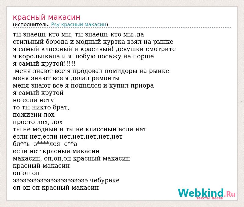 ты знаешь кто мы, ты знаешь кто мы..да стильный борода и модный куртка взял на рынке я самый классный и красивый! девушки смотрите я корольпкапа и я любую посажу на порше я самый крутой!!!!! меня знают все я продовал помидоры на рынке меня знают все я делал ремонты меня знают все я поднялся и купил приора я самый крутой но если нету то ты никто брат, пожизни лох просто лох, лох ты не модный и ты не классный если нет если нет,если нет,нет,нет,нет,нет бл**ь з****лся с**а если нет красный макасин макасин, оп,оп,оп красный макасин красный макасин оп оп оп ээээээээээээээээээээээ чебуреке оп оп оп красный макасин
