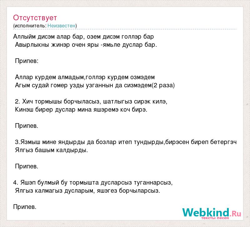 Аллыйм дисэм алар бар, озем дисэм голлэр бар Авырлыкны жинэр очен яры -ямьле дуслар бар. Припев: Аллар курдем алмадым,голлэр курдем озмэдем Агым судай гомер узды узганнын да сизмэдем(2 раза) 2. Хич тормышы борчыласыз, шатлыгыз сирэк килэ, Кинэш бирер дуслар мина яшэремэ коч бирэ. Припев. 3.Язмыш мине яндырды да бозлар итеп тундырды,бирэсен биреп бетергэч Ялгыз башым калдырды. Припев. 4. Яшэп булмый бу тормышта дусларсыз туганнарсыз, Ялгыз калмагыз дусларым, яшэгез борчыларсыз. Припев.