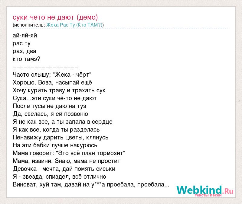 ай-яй-яй рас ту раз, два кто тамэ? ================== Часто слышу; "Жека - чёрт" Хорошо. Вова, насыпай ещё Хочу курить траву и трахать сук Сука...эти суки чё-то не дают После тусы не даю на туз Да, свелась, я ей позвоню Я не как все, а ты запала в сердце Я как все, когда ты разделась Ненавижу дарить цветы, клянусь На эти бабки лучше накурюсь Мама говорит: "Это всё план тормозит" Мама, извини. Знаю, мама не простит Девочка - мечта, дай помять сиськи Я - звезда, спиздел, всё отлично Виноват, хуй там, давай на у***а проебала, проебала...