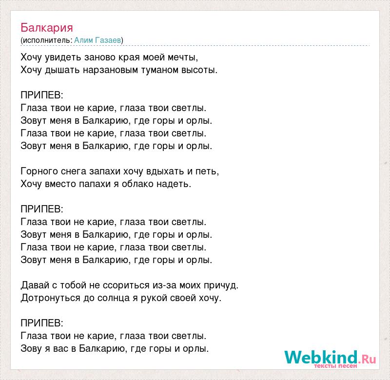 Хочу увидеть заново края моей мечты, Хочу дышать нарзановым туманом высоты. ПРИПЕВ: Глаза твои не карие, глаза твои светлы. Зовут меня в Балкарию, где горы и орлы. Глаза твои не карие, глаза твои светлы. Зовут меня в Балкарию, где горы и орлы. Горного снега запахи хочу вдыхать и петь, Хочу вместо папахи я облако надеть. ПРИПЕВ: Глаза твои не карие, глаза твои светлы. Зовут меня в Балкарию, где горы и орлы. Глаза твои не карие, глаза твои светлы. Зовут меня в Балкарию, где горы и орлы. Давай с тобой не ссориться из-за моих причуд. Дотронуться до солнца я рукой своей хочу. ПРИПЕВ: Глаза твои не карие, глаза твои светлы. Зову я вас в Балкарию, где горы и орлы.