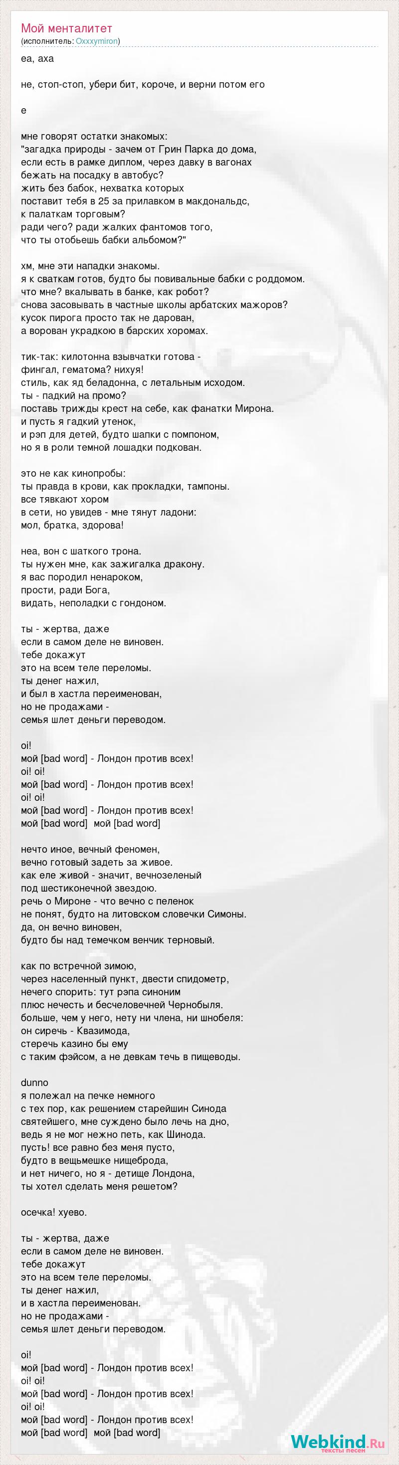 еа, аха не, стоп-стоп, убери бит, короче, и верни потом его е мне говорят остатки знакомых: "загадка природы - зачем от Грин Парка до дома, если есть в рамке диплом, через давку в вагонах бежать на посадку в автобус? жить без бабок, нехватка которых поставит тебя в 25 за прилавком в макдональдс, к палаткам торговым? ради чего? ради жалких фантомов того, что ты отобьешь бабки альбомом?" хм, мне эти нападки знакомы. я к сваткам готов, будто бы повивальные бабки с роддомом. что мне? вкалывать в банке, как робот? снова засовывать в частные школы арбатских мажоров? кусок пирога просто так не дарован, а ворован украдкою в барских хоромах. тик-так: килотонна взывчатки готова - фингал, гематома? нихуя! стиль, как яд беладонна, с летальным исходом. ты - падкий на промо? поставь трижды крест на себе, как фанатки Мирона. и пусть я гадкий утенок, и рэп для детей, будто шапки с помпоном, но я в роли темной лошадки подкован. это не как кинопробы: ты правда в крови, как прокладки, тампоны. все тявкают хором в сети, но увидев - мне тянут ладони: мол, братка, здорова! неа, вон с шаткого трона. ты нужен мне, как зажигалка дракону. я вас породил ненароком, прости, ради Бога, видать, неполадки с гондоном. ты - жертва, даже если в самом деле не виновен. тебе докажут это на всем теле переломы. ты денег нажил, и был в хастла переименован, но не продажами - семья шлет деньги переводом. oi! мой [bad word] - Лондон против всех! oi! oi! мой [bad word] - Лондон против всех! oi! oi! мой [bad word] - Лондон против всех! мой [bad word] мой [bad word] нечто иное, вечный феномен, вечно готовый задеть за живое. как еле живой - значит, вечнозеленый под шестиконечной звездою. речь о Мироне - что вечно с пеленок не понят, будто на литовском словечки Симоны. да, он вечно виновен, будто бы над темечком венчик терновый. как по встречной зимою, через населенный пункт, двести спидометр, нечего спорить: тут рэпа синоним плюс нечесть и бесчеловечней Чернобыля. больше, чем у него, нету ни члена, ни шнобеля: он сиречь - Квазимода, стеречь казино бы ему с таким фэйсом, а не девкам течь в пищеводы. dunno я полежал на печке немного с тех пор, как решением старейшин Синода святейшего, мне суждено было лечь на дно, ведь я не мог нежно петь, как Шинода. пусть! все равно без меня пусто, будто в вещьмешке нищеброда, и нет ничего, но я - детище Лондона, ты хотел сделать меня решетом? осечка! хуево. ты - жертва, даже если в самом деле не виновен. тебе докажут это на всем теле переломы. ты денег нажил, и в хастла переименован. но не продажами - семья шлет деньги переводом. oi! мой [bad word] - Лондон против всех! oi! oi! мой [bad word] - Лондон против всех! oi! oi! мой [bad word] - Лондон против всех! мой [bad word] мой [bad word]