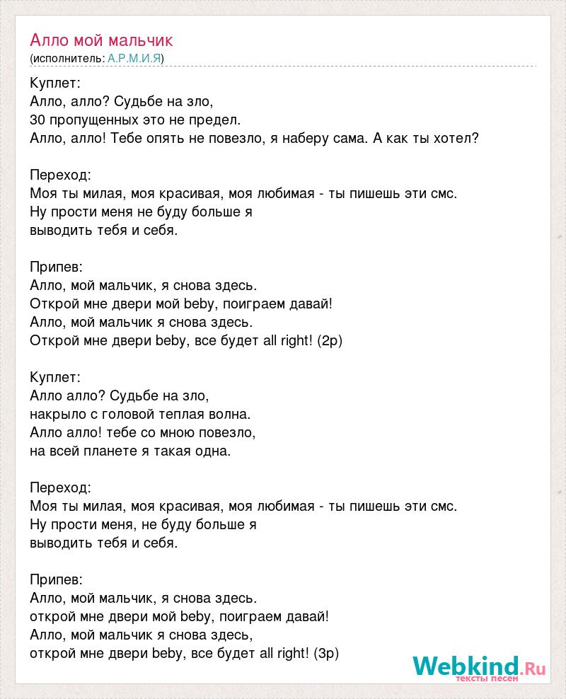 Куплет: Алло, алло? Судьбе на зло, 30 пропущенных это не предел. Алло, алло! Тебе опять не повезло, я наберу сама. А как ты хотел? Переход: Моя ты милая, моя красивая, моя любимая - ты пишешь эти смс. Ну прости меня не буду больше я выводить тебя и себя. Припев: Алло, мой мальчик, я снова здесь. Открой мне двери мой beby, поиграем давай! Алло, мой мальчик я снова здесь. Открой мне двери beby, все будет all right! (2р) Куплет: Алло алло? Судьбе на зло, накрыло с головой теплая волна. Алло алло! тебе со мною повезло, на всей планете я такая одна. Переход: Моя ты милая, моя красивая, моя любимая - ты пишешь эти смс. Ну прости меня, не буду больше я выводить тебя и себя. Припев: Алло, мой мальчик, я снова здесь. открой мне двери мой beby, поиграем давай! Алло, мой мальчик я снова здесь, открой мне двери beby, все будет all right! (3р)